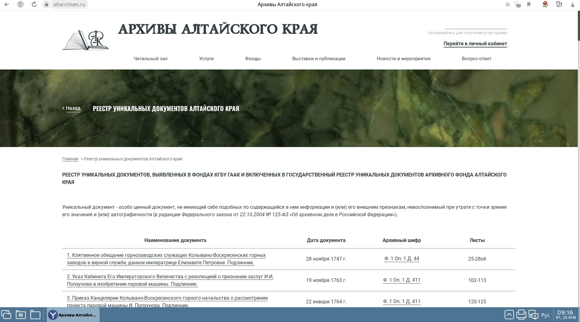 Всего в Государственный реестр уникальныхдокументов Архивного фонда Алтайского края на сегодняшний день включено120 документов. Все они доступны в электронном виде на Портале «Архивы Алтайского края».