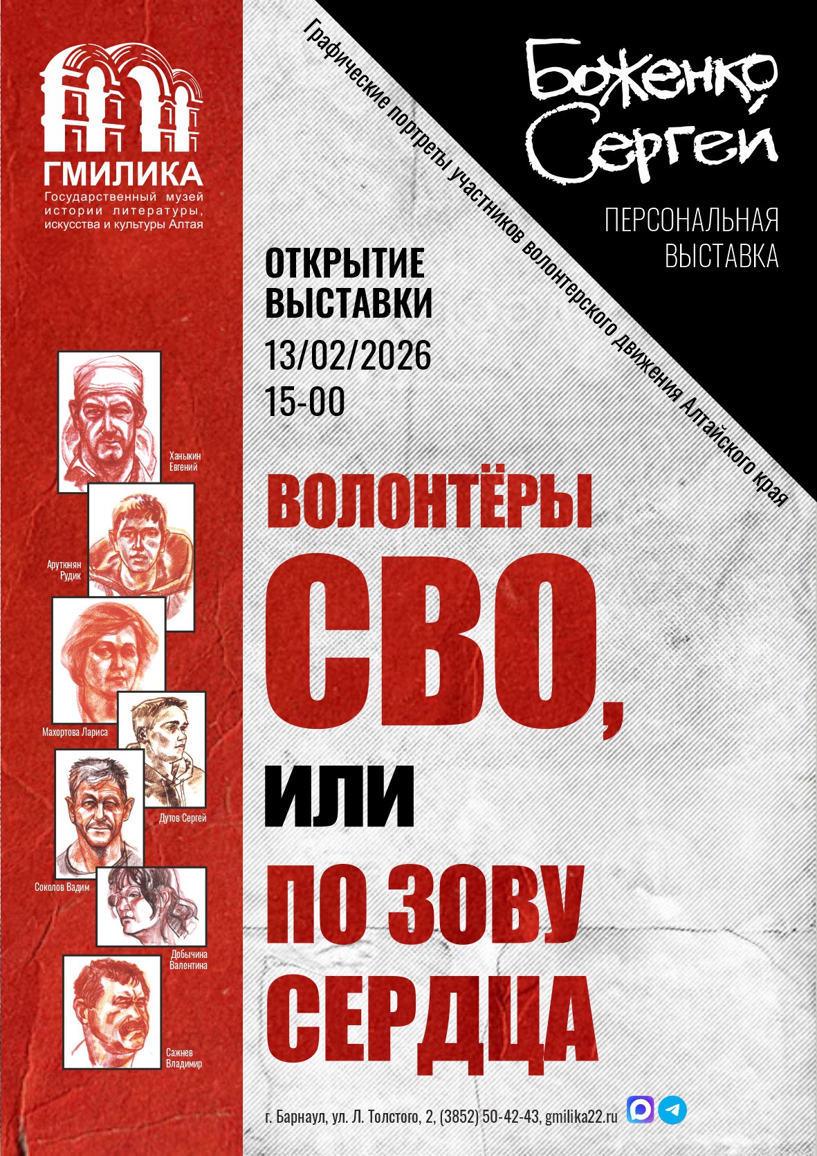 13 февраля в Государственном музее истории литературы, искусства и культуры Алтая состоится открытие выставки графических портретов участников волонтерского движения Алтайского края «Волонтеры СВО, или По зову сердца».