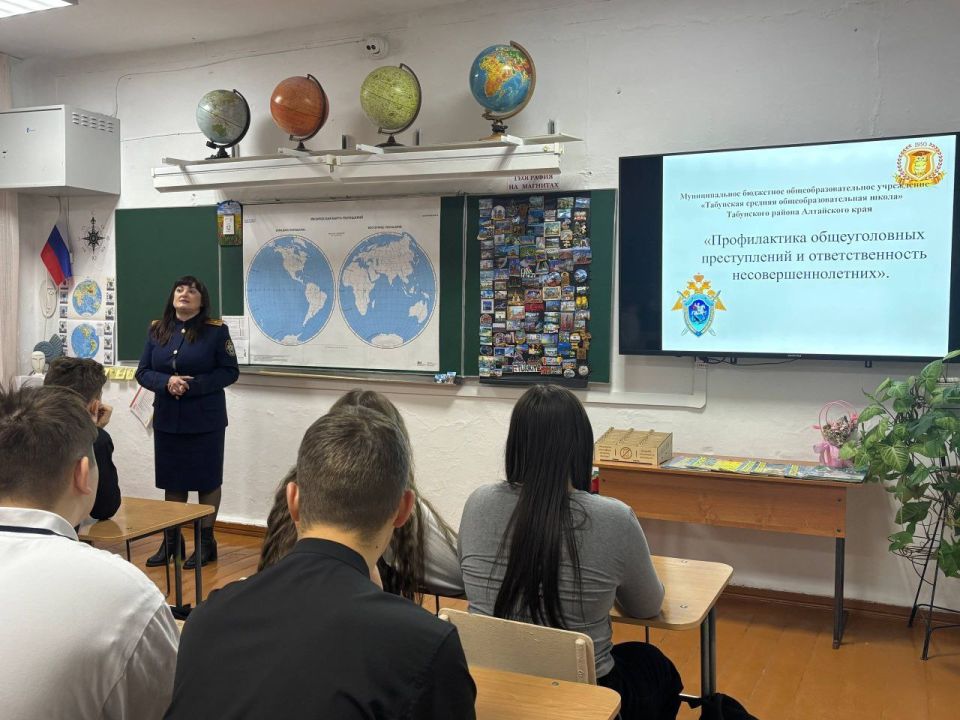 В рамках Недели правовой помощи следователь Кулундинского межрайонного следственного отдела следственного управления Следственного комитета РФ по Алтайскому краю Юлия Викторовна Росенко встретилась с учениками 8-х классов Табунской средней...