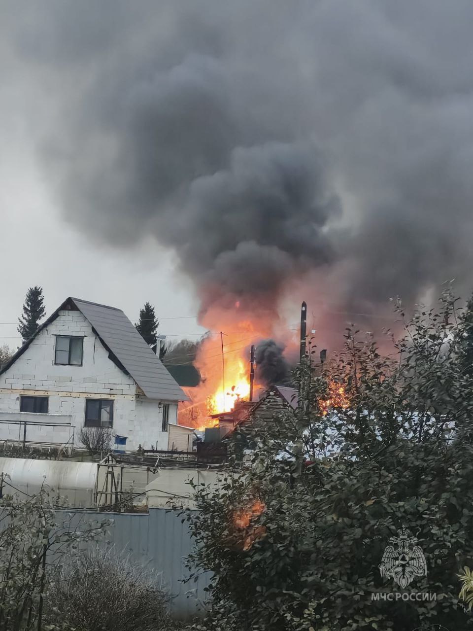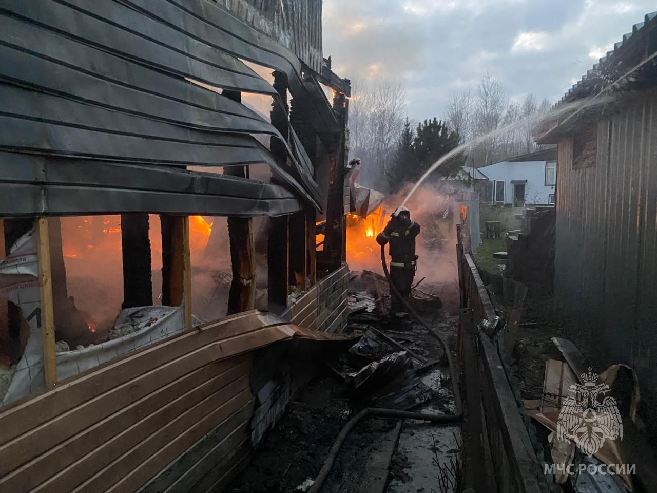 В результате пожара поврежден двухэтажный дом, деревянная беседка, стена бани, стена гаража, а также сайдинг соседнего дома.