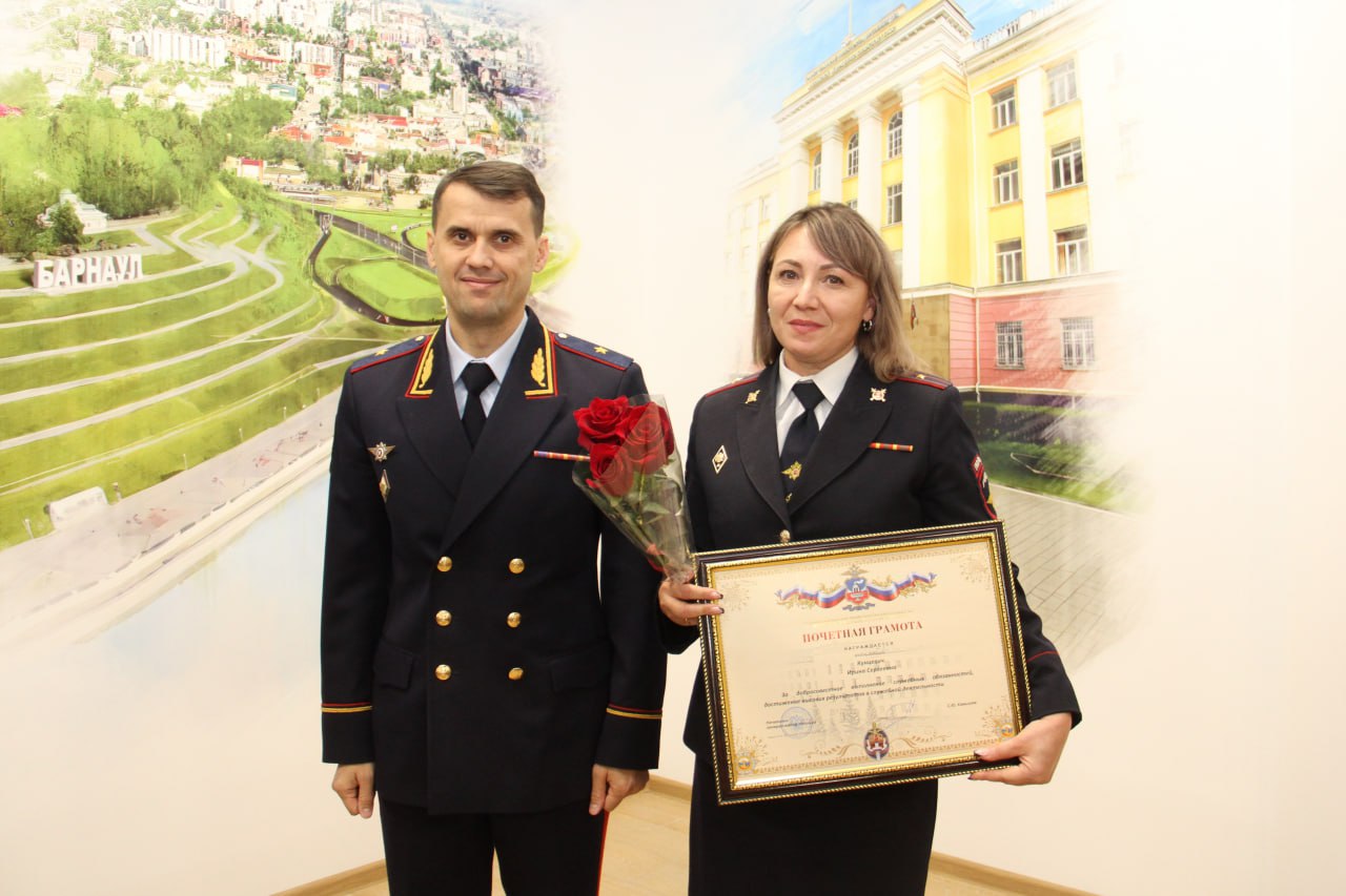 Ряд сотрудников за образцовое исполнение служебных обязанностей и достигнутые успехи в работе были отмечены Почетными грамотами ГУ МВД России по Алтайскому краю, благодарностями и ценными подарками. Памятный адрес вручен начальнику отдела организации дознания Главного управления полковнику полиции Татьяне Ольдт.