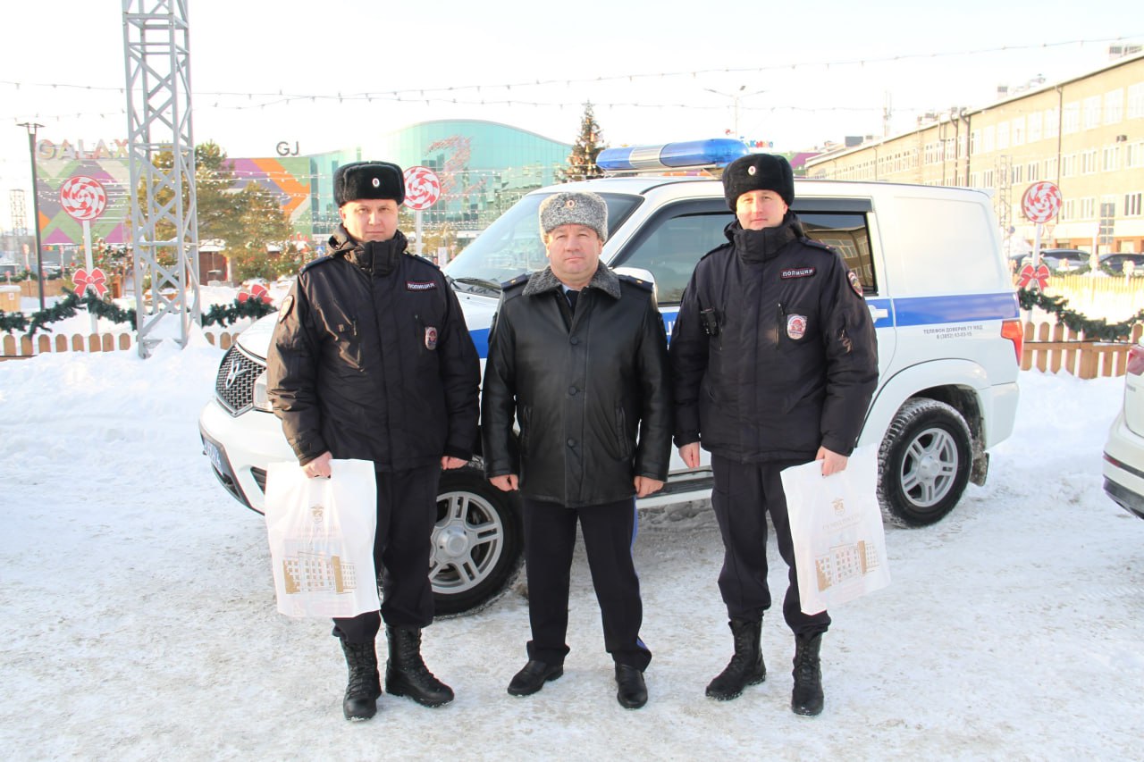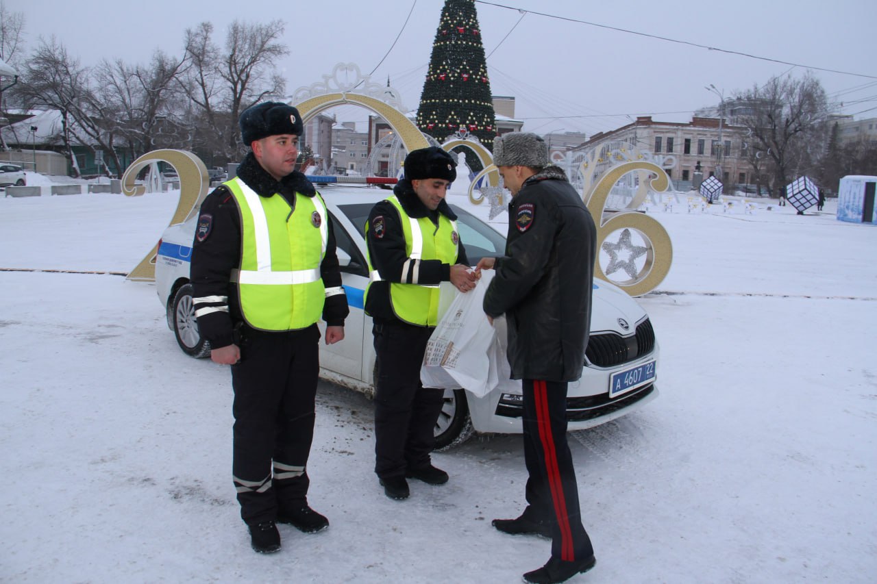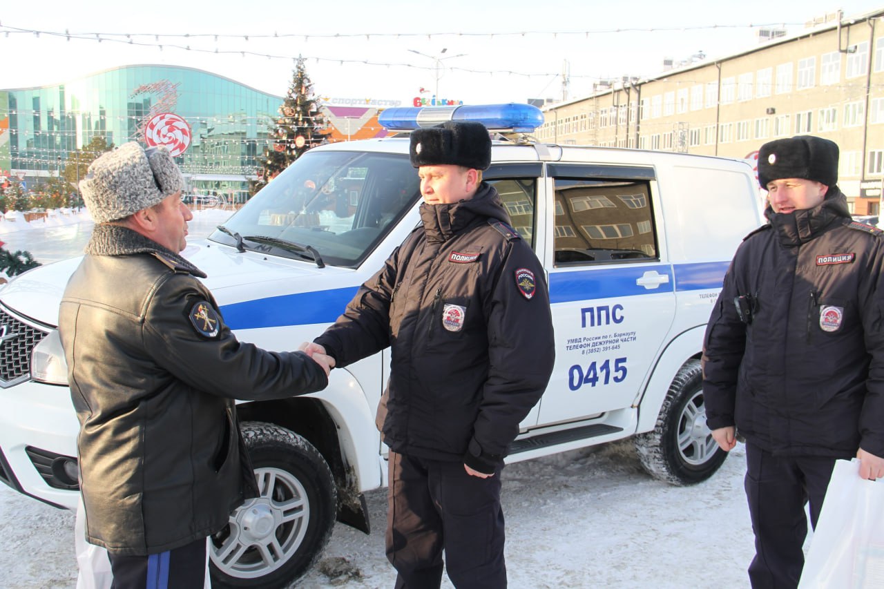 Заместитель начальника Главного управления – начальник полиции генерал-майор полиции Марк Левин, заместитель начальника Главного управления – начальник ГСУ, генерал-майор юстиции Александр Медведев, заместители начальника: полковник полиции Виталий Полтарыхин, полковник полиции Александр Хрипков и полковник внутренней службы Александр Баев в канун новогодних праздников проверили несение службы наружными нарядами в городе Барнауле и вручили новогодние подарки для детей сотрудникам ДПС и ППС.