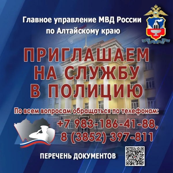 Для поступления на службу необходимо обратиться в кадровое подразделение территориального органа МВД России на районном уровне Алтайского края либо посредством федеральной государственной информационной системы «Единый портал государственных и муниципальных услуг» сервис «Поступление на службу в органы внутренних дел Российской Федерации».