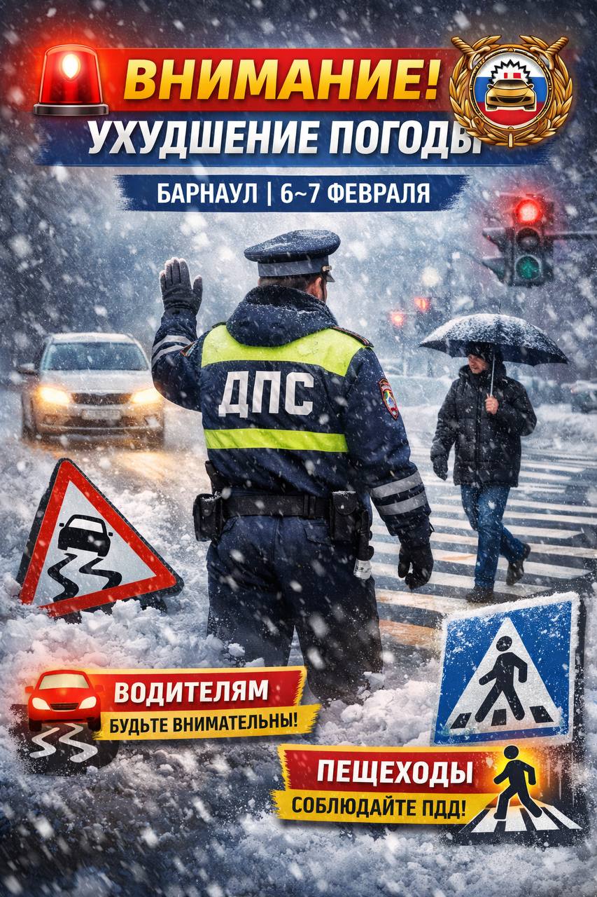 Госавтоинспекция информирует жителей и гостей города Барнаула о неблагоприятных метеоусловиях, которые ожидаются 6 7 февраля.