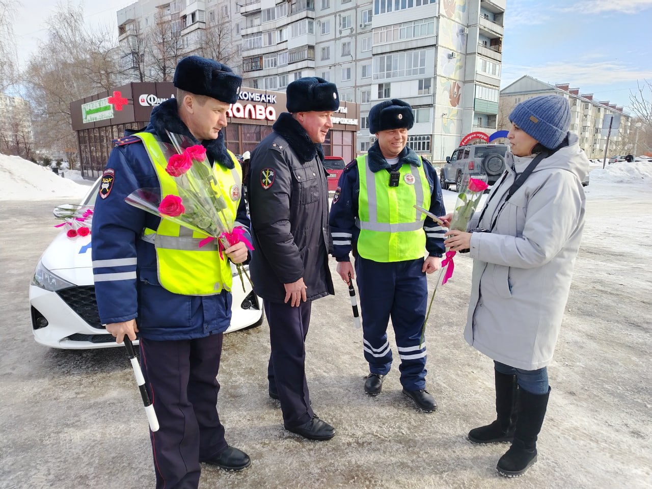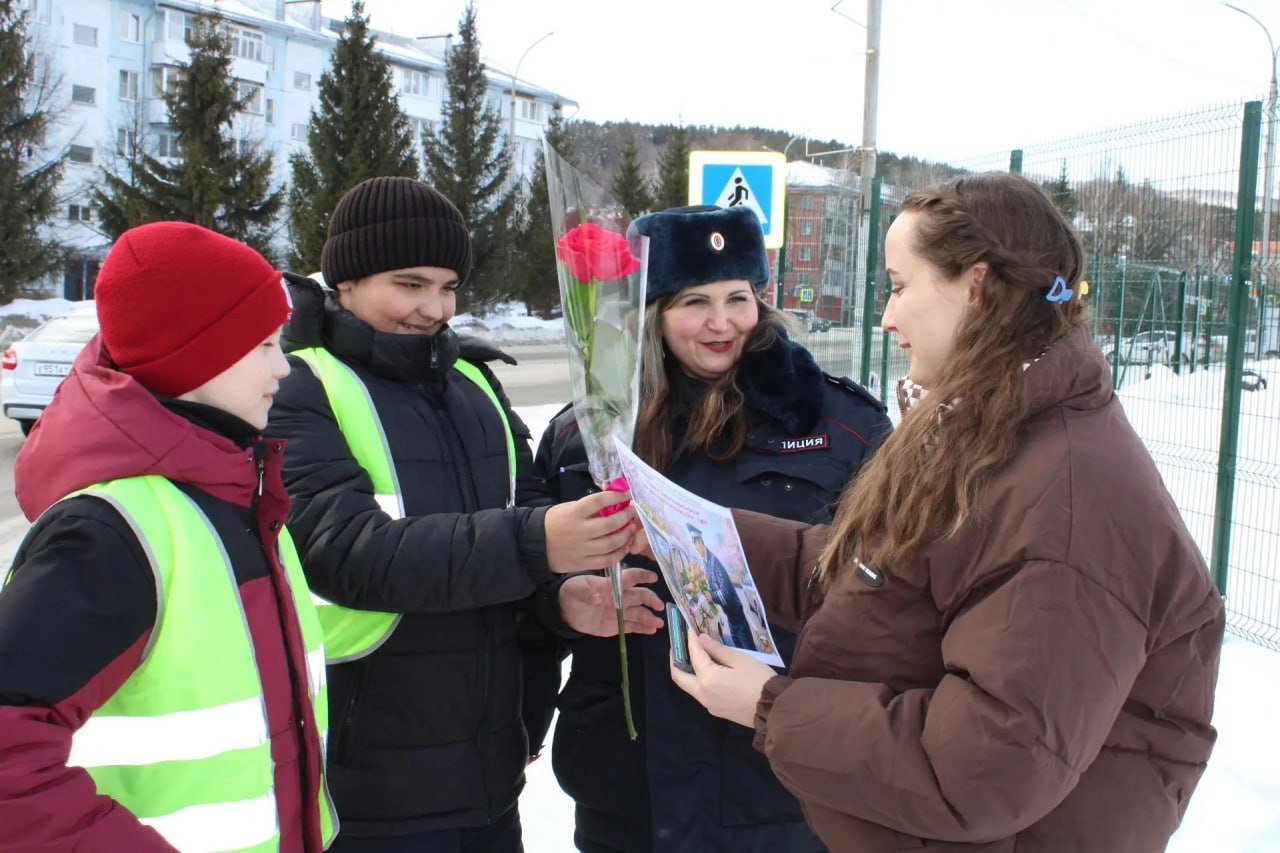 Сотрудники Госавтоинспекции г. Белокуриха совместно с отрядом ЮИД «Жезл» МБОУ «Белокурихинская СОШ №2» и представителем общественного совета МО МВД России «Белокурихинский» Олесей Логиновой в преддверии празднования Международного женского дня в рамках акции «Цветы для автоледи» вручали цветы и поздравительные открытки женщинам-водителям.