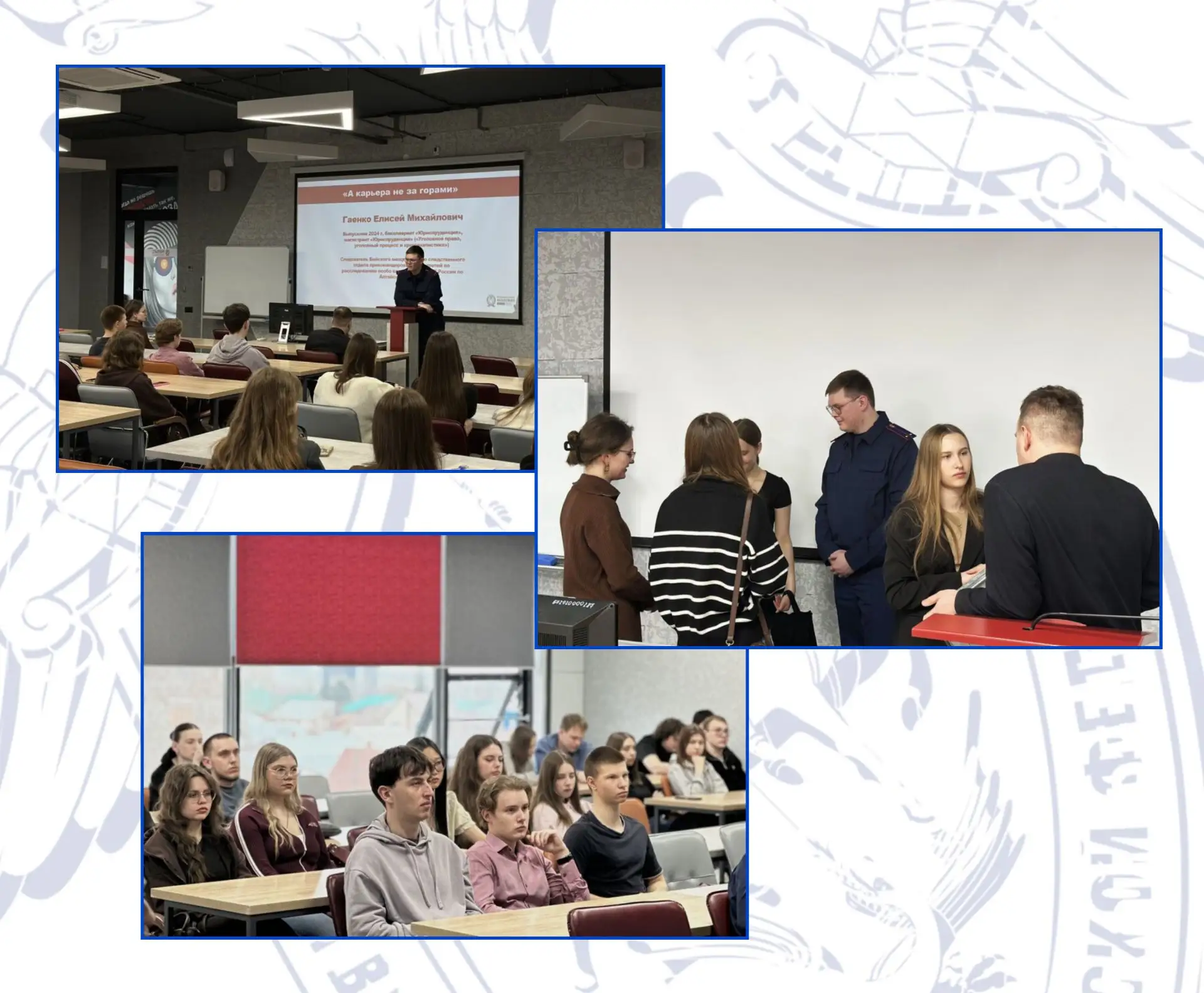 Перед аудиторией, как выпускник Президентской академии, выступил следователь Бийского межрайонного следственного отдела следственного управления Следственного комитета РФ по Алтайскому краю Елисей Гаенко, который в настоящее время прикомандирован в третий отдел по расследованию особо важных дел. Офицер ведомства поделился со студентами личным опытом профессионального становления. Он подробно остановился на специфике работы следователя СК России, рассказал о высоких эмоциональных нагрузках, необходимости оперативного принятия решений в нестандартных ситуациях и работе с тяжёлыми обстоятельствами. Особое внимание представитель Следственного комитета уделил вопросу преодоления трудностей на первоначальных этапах службы. Елисей Гаенко подчеркнул, что залогом успешной карьеры является постоянное самообразование и стремление получать практические навыки уже во время обучения в вузе. В этой связи он акцентировал внимание на деятельности института общественного помощника следователя, назвав его уникальной возможностью для студентов погрузиться в профессию и адаптироваться к будущим служебным задачам.