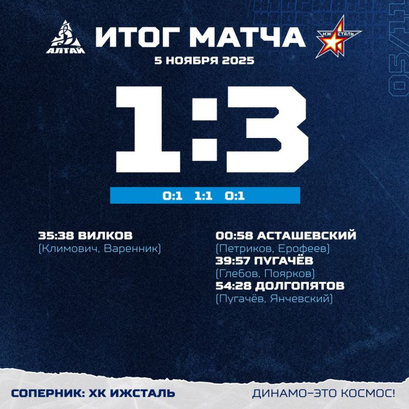 Нашу единственную шайбу сегодня забросил Антон Вилков.Дальше по календарю у "Динамо-Алтай" выезд по маршруту Саратов - Пенза - Рязань - Тула.