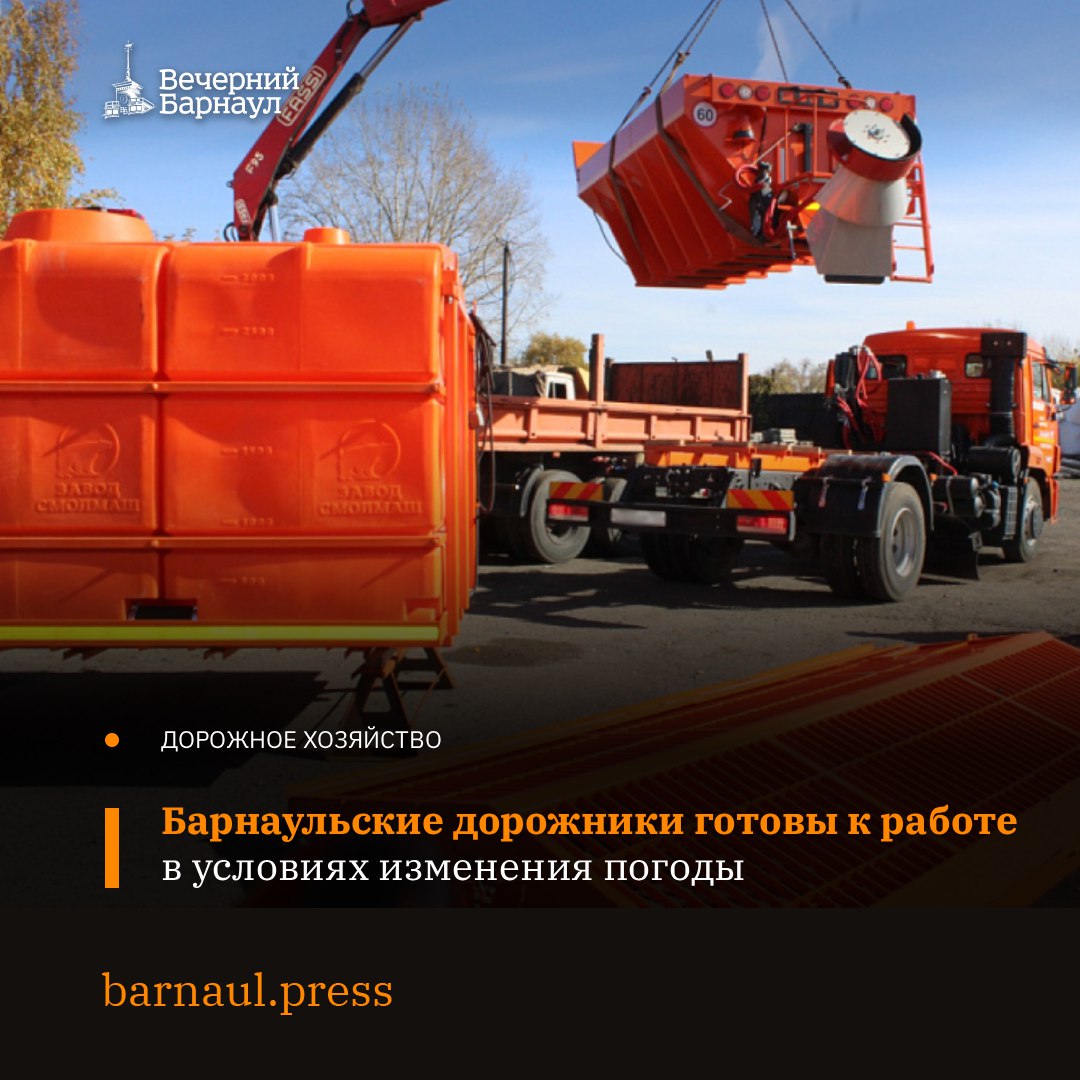 Руководитель МБУ «Автодорстрой» Барнаула Виктор Райко сообщил, что с учётом погоды специалисты провели частичное переоборудование техники во всех дорожно-эксплуатационных участках. В случае осадков и похолодания часть техники готова к работе. На коммунально-дорожных машинах заменили цистерны с водой на бункеры для распределения реагентов, проверили состояние отвалов и щёток.