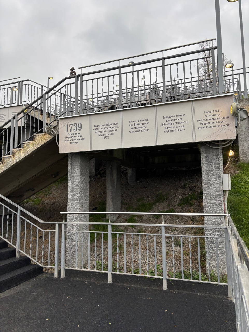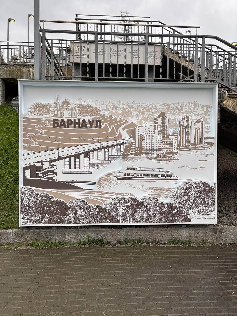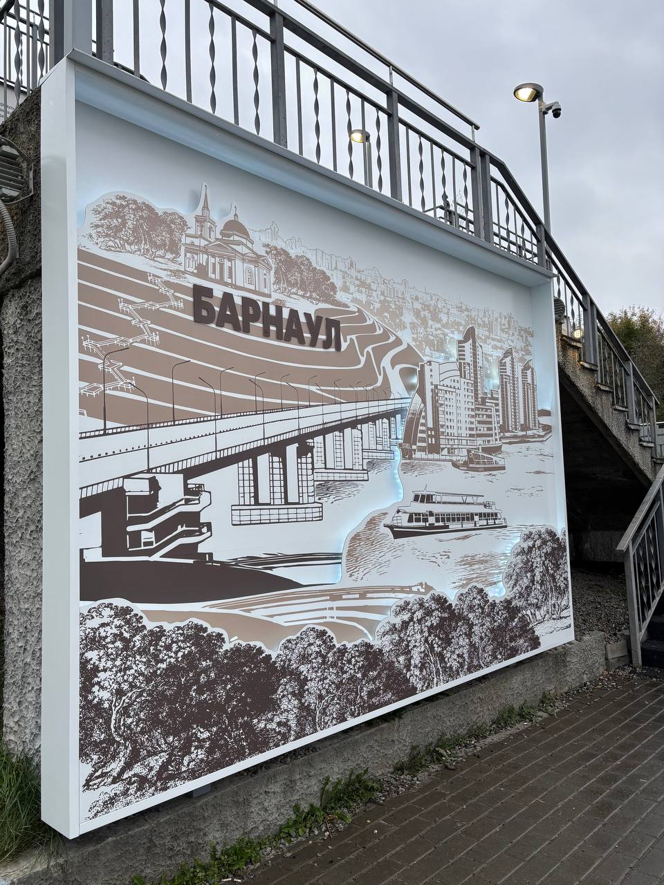У начала подъема по лестнице появилось большое панно с барнаульским пейзажем — Новый мост, террасы Нагорного парка, дома ЖК «Аквамарин», теплоход, плывущий по Оби. Оно ещё и с подсветкой!