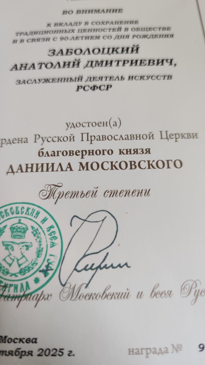 Кинооператор Анатолий Заболоцкий, работавший много лет с Василием Шукшиным, удостоен высокой церковной награды.