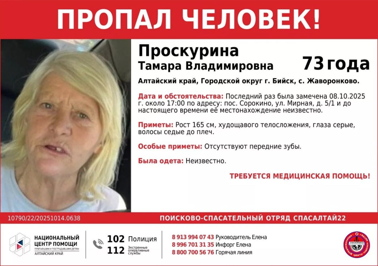 Последний раз Тамара Владимировна Проскурина была замечена вечером 8 октября по адресу: посёлок Сорокино, улица Мирная 5/1, и до настоящего времени её местонахождение неизвестно.