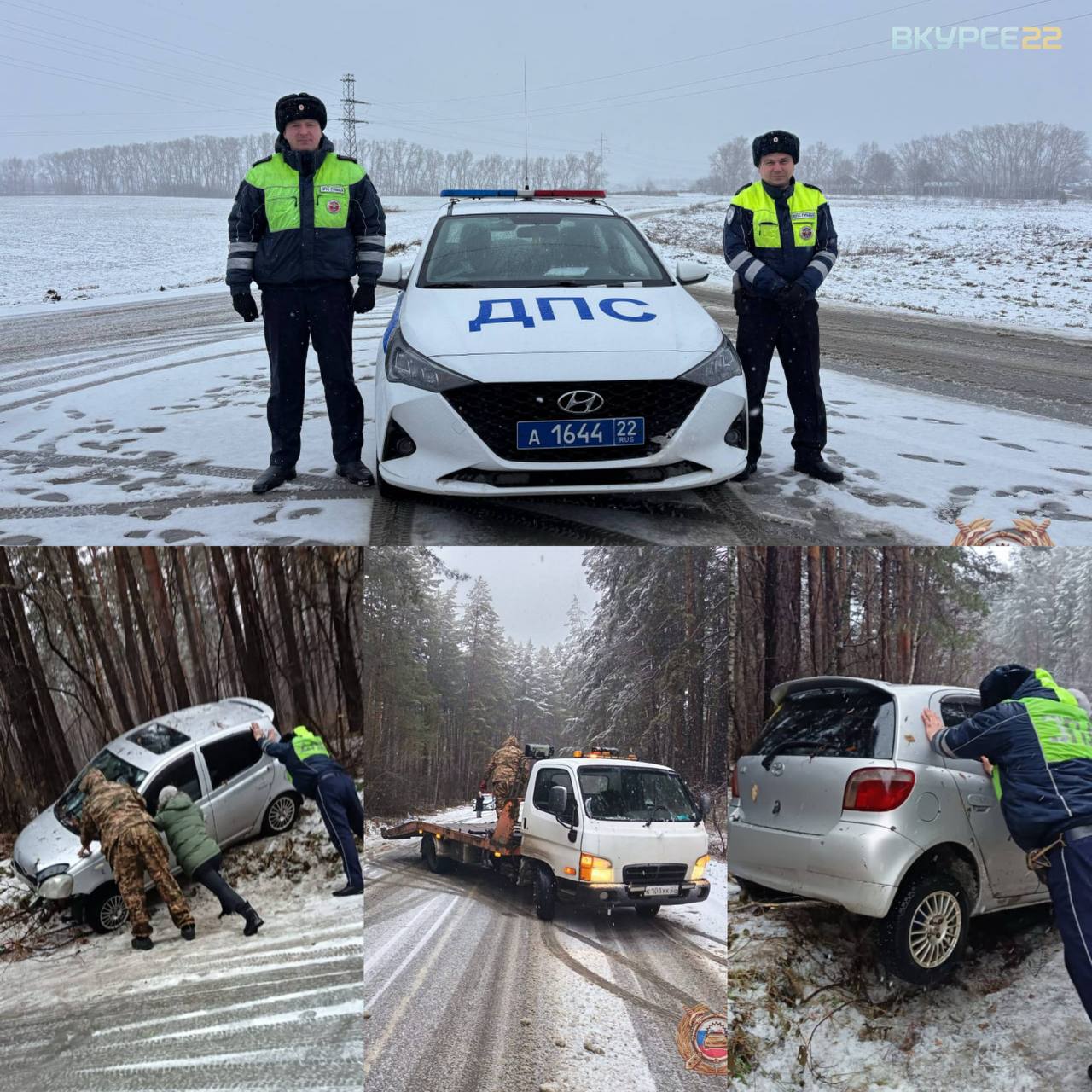 Сотрудники ГИБДД пришли на помощь водителю, которая не справилась с управлением на скользкой дороге и оказалась в кювете.