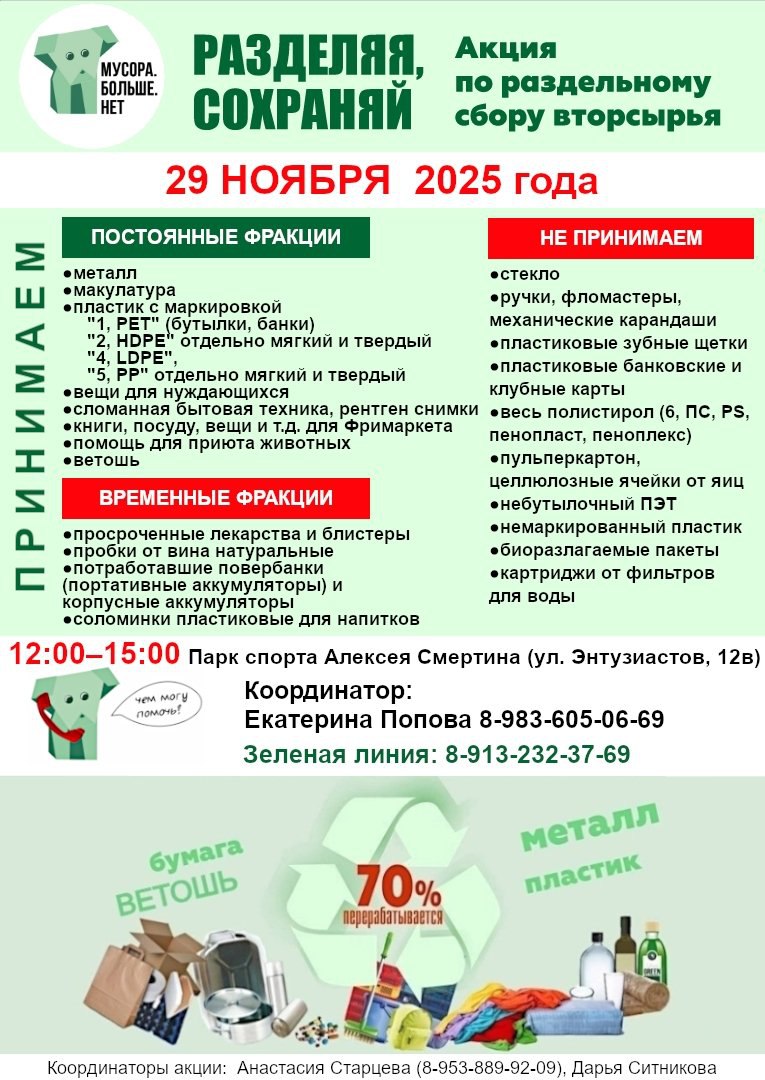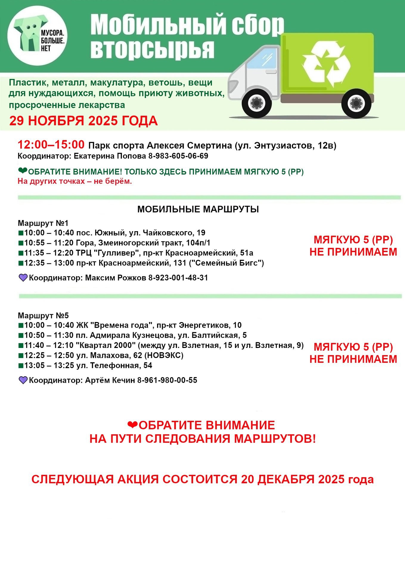 29 ноября в краевой столице состоится акция по раздельному сбору мусора. Стационарная точка будет работать с 12 до 15 часов в парке Смертина (ул. Энтузиастов, 12в). Также будут работать мобильные маршруты. Их расписание – на картинке.