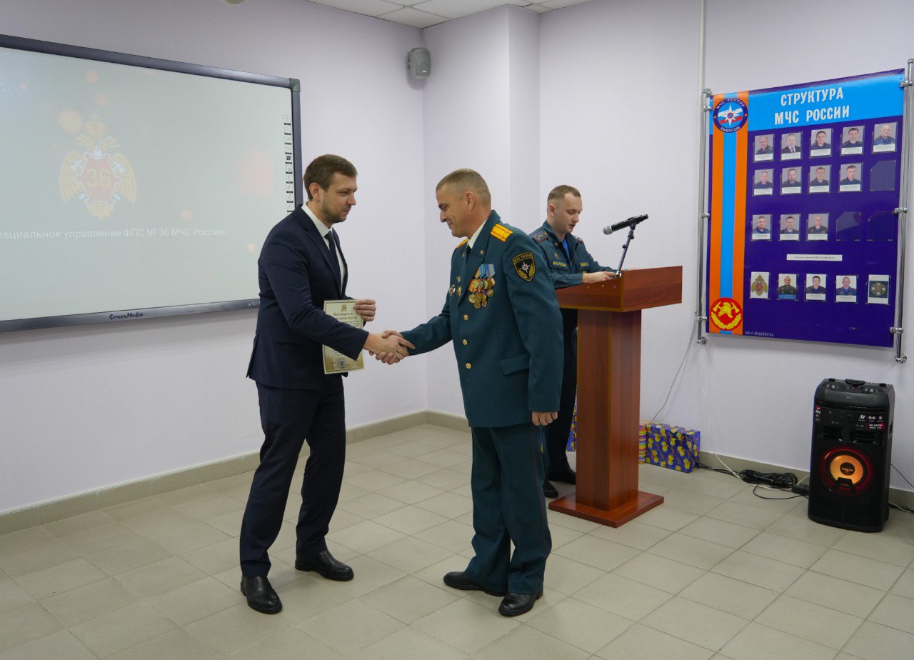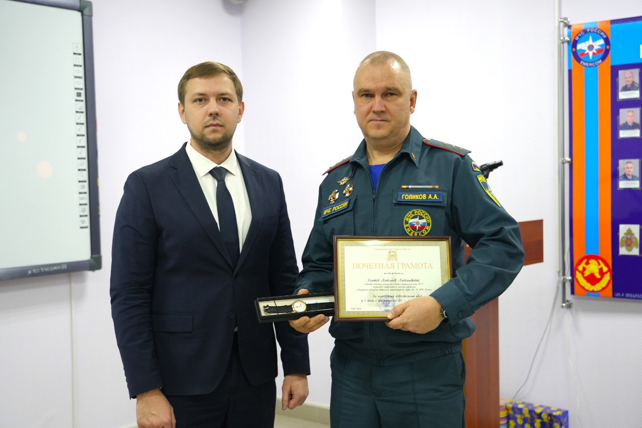 На торжественном собрании вручил Почетные грамоты Администрации города старшему прапорщику Александру Голикову и майору Константину Челнокову. Также объявил Благодарность коллективу специальной пожарно-спасательной части №6 — за высокий профессионализм, слаженность и преданность делу.