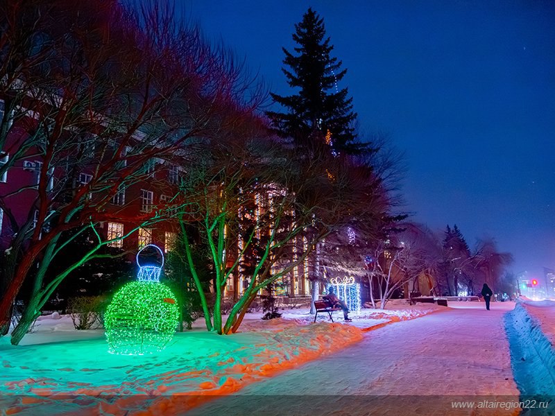 Алтайский государственный аграрный университет преобразился к Новому году. Здание и сквер перед главным корпусом украсили праздничной подсветкой: установили шесть светоконструкций и более километра гирлянд.