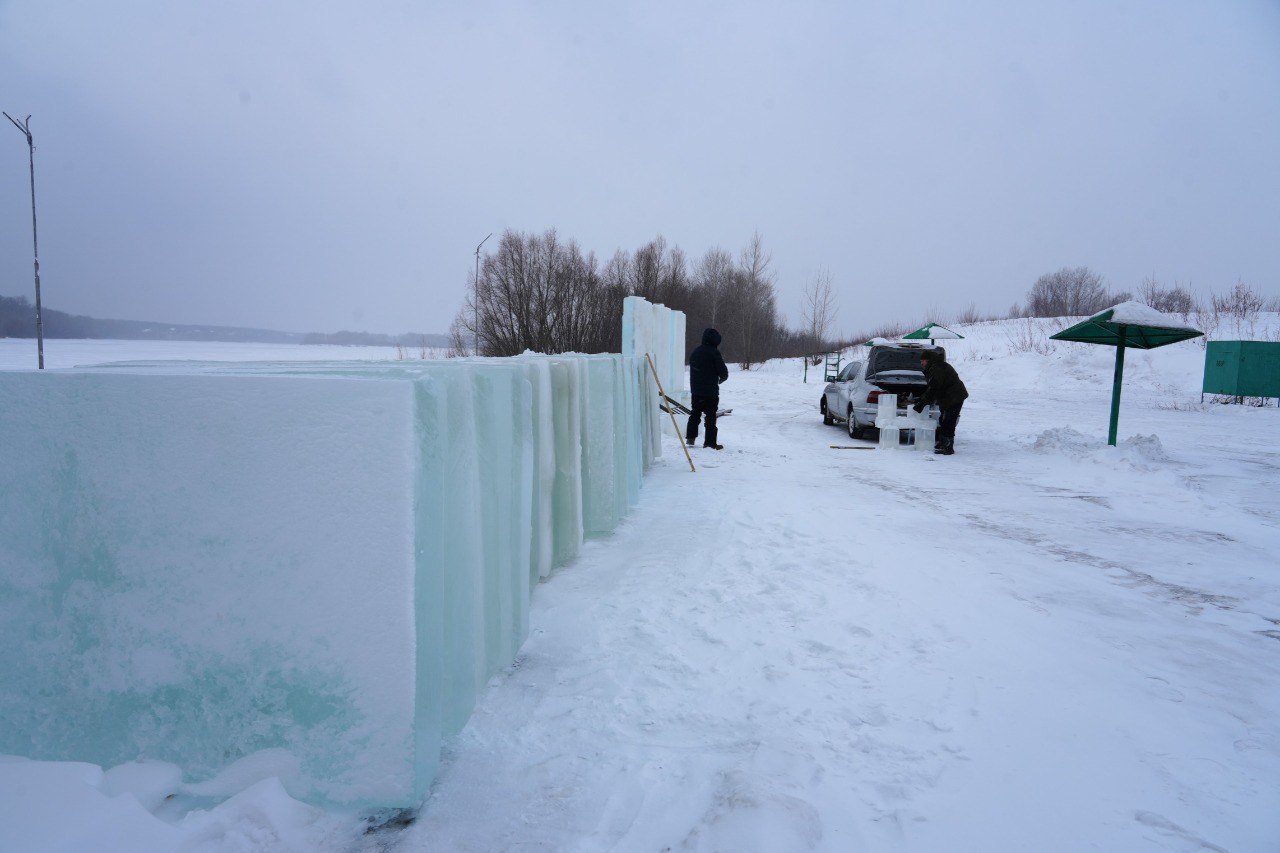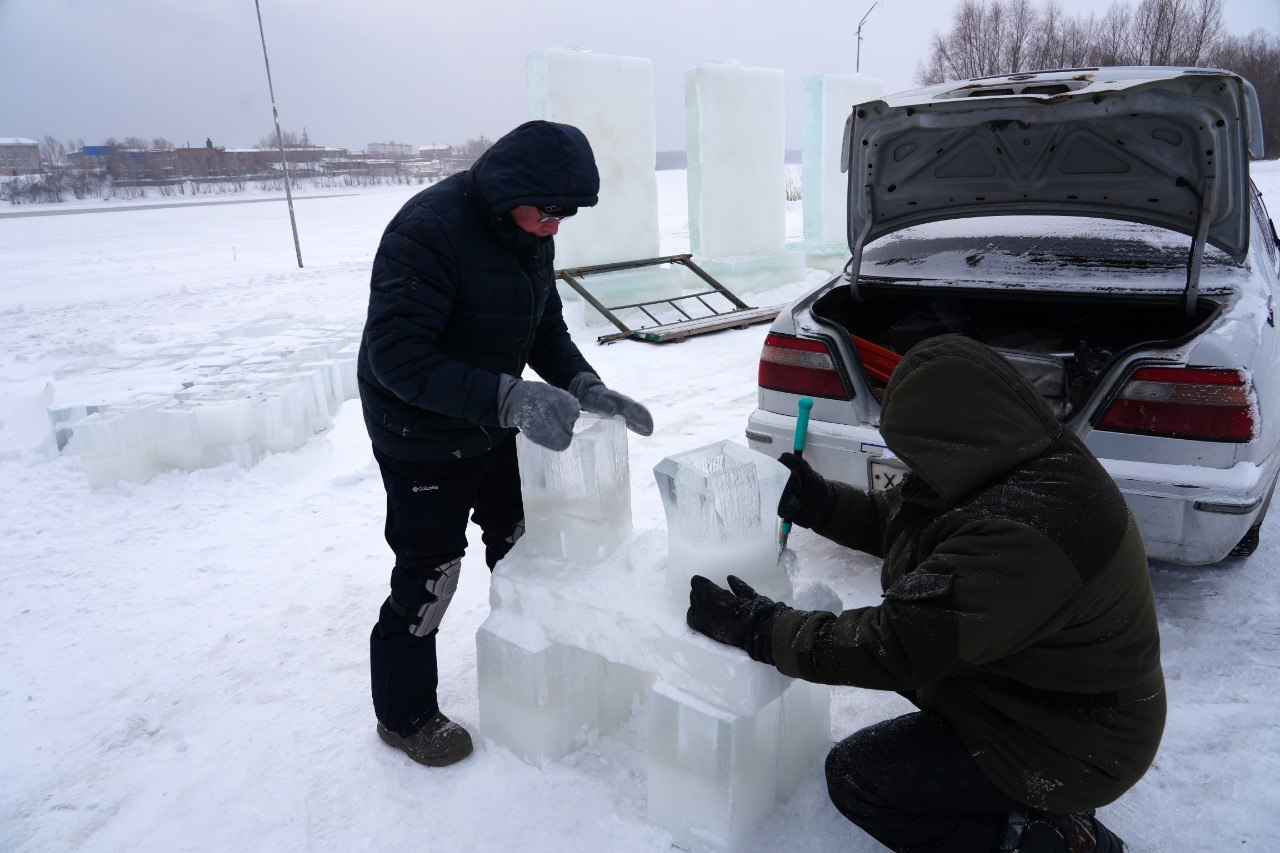 На городском пляже у коммунального моста началась подготовка к празднованию Крещения Господня. Команда профессиональных скульпторов приступила к созданию традиционных ледяных композиций.