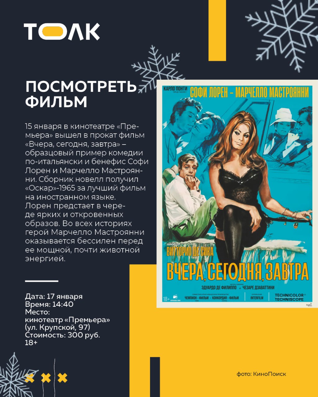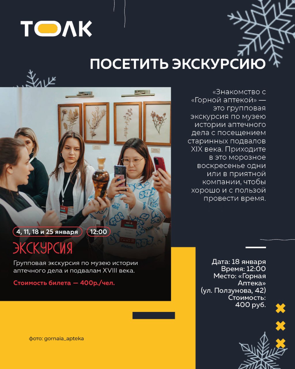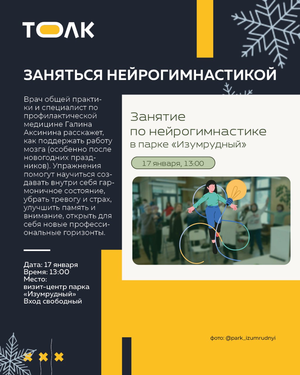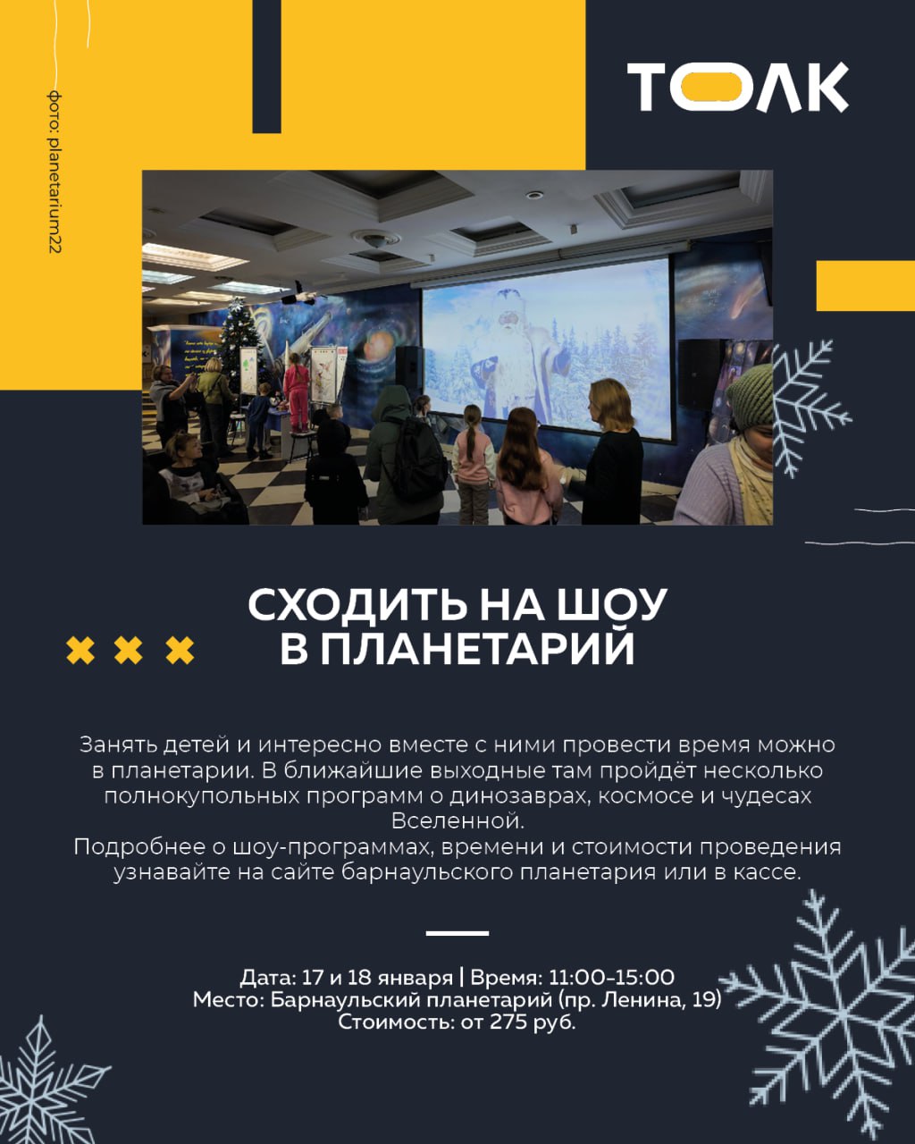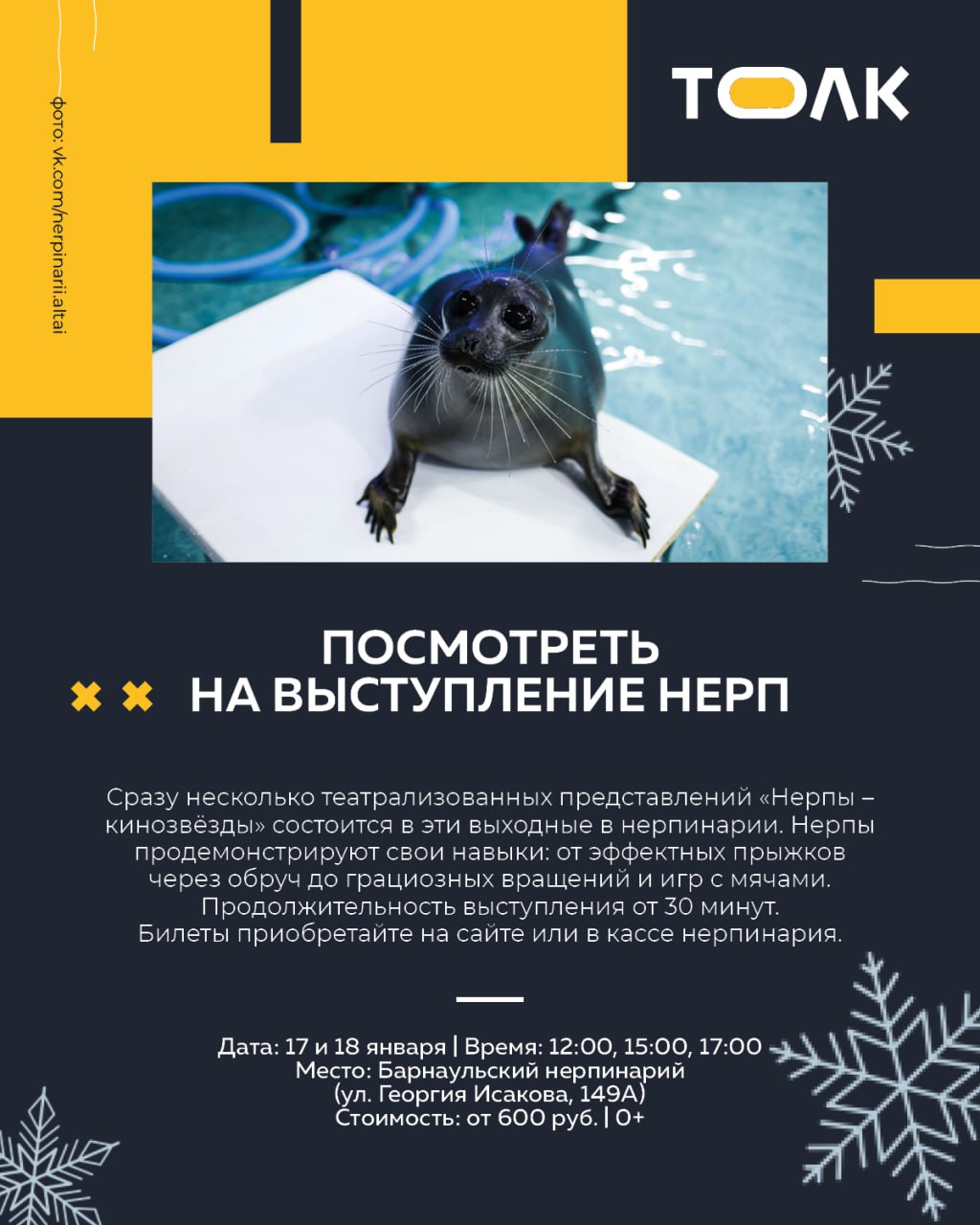 Холодная погода не мешает выходным быть насыщенными! Мы собрали для вас главные события: выступление нерп, кукольные спектакли, занятие нейрогимнастикой и экскурсия. Планируйте свои выходные заранее и наслаждайтесь яркими впечатлениями!