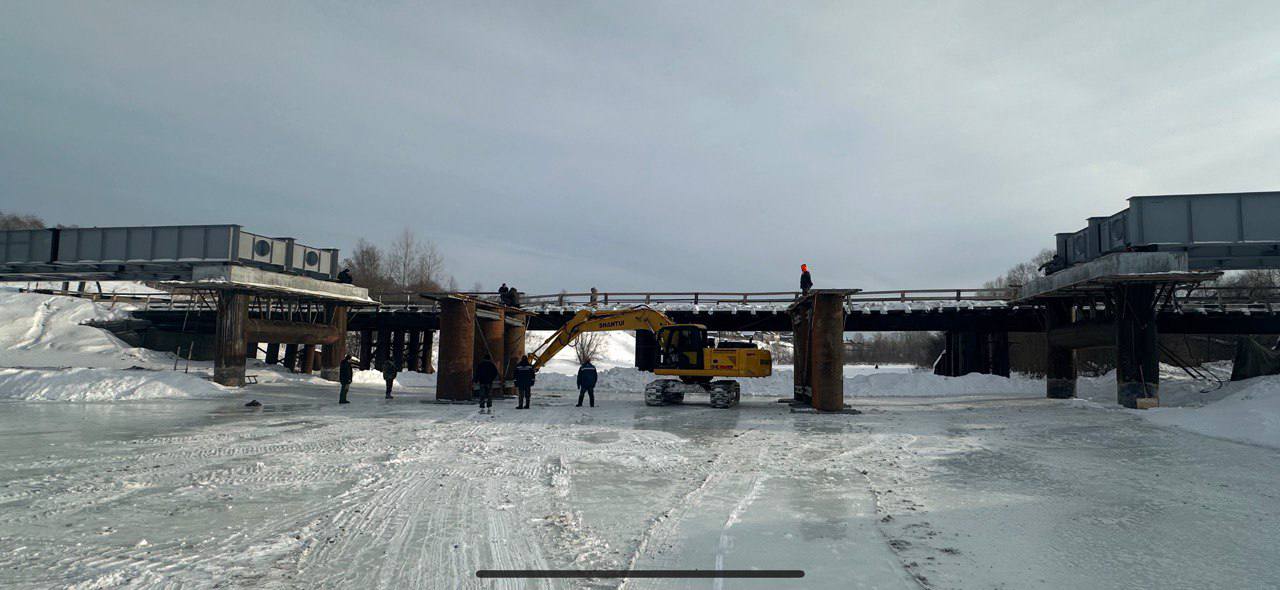 Сейчас на объекте идет сборка металлических пролетных строений, из трех – два уже смонтированы. В дальнейшем на них уложат деревянный настил. Также в летний период предусмотрено обновление подъездных путей.