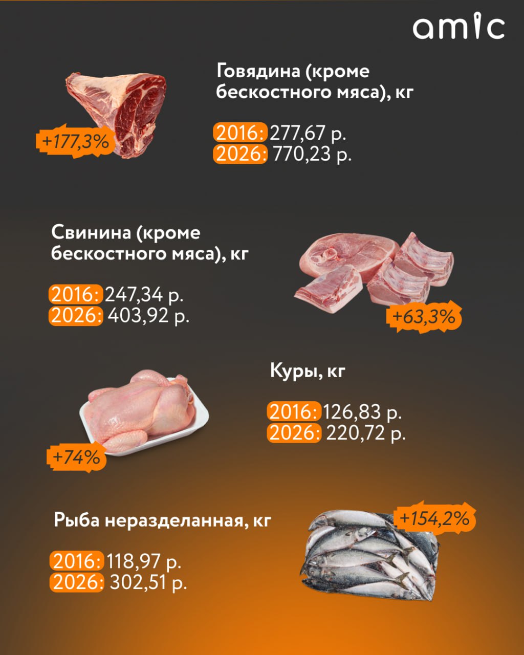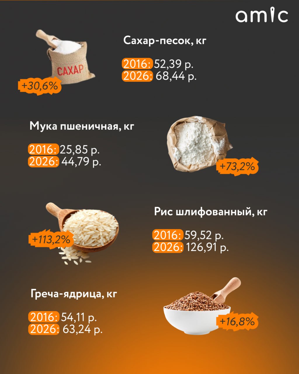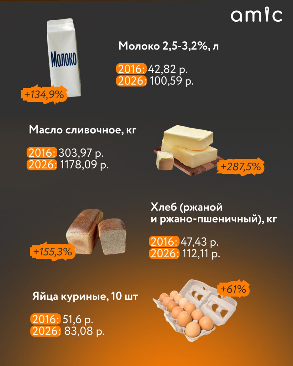 Цены за январь 2016 года мы взяли из единой межведомственной информационно-статистической системы (ЕМИСС), а нынешние – из актуальной сводки Алтайкрайстата за 12 января 2026 года. Подчеркиваем, что в обоих случаях указаны средние цены по региону, которые могут заметно отличаться от стоимости в конкретных магазинах.