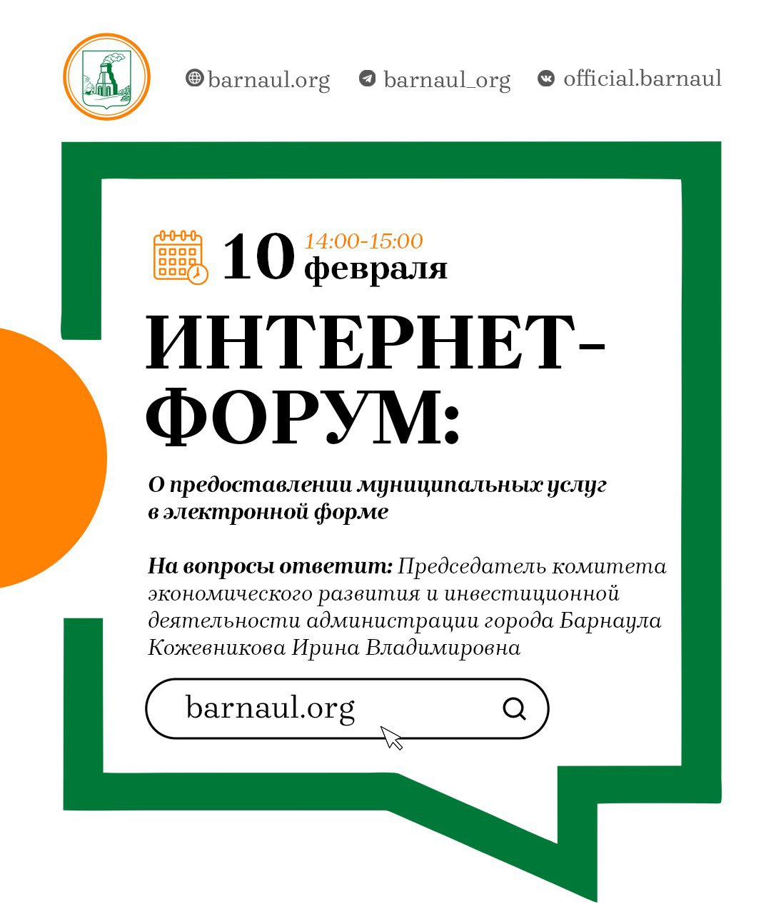 Завтра, 10 февраля, с 14.00 до 15.00 на официальном интернет-сайте города Барнаула пройдет интернет-форум.