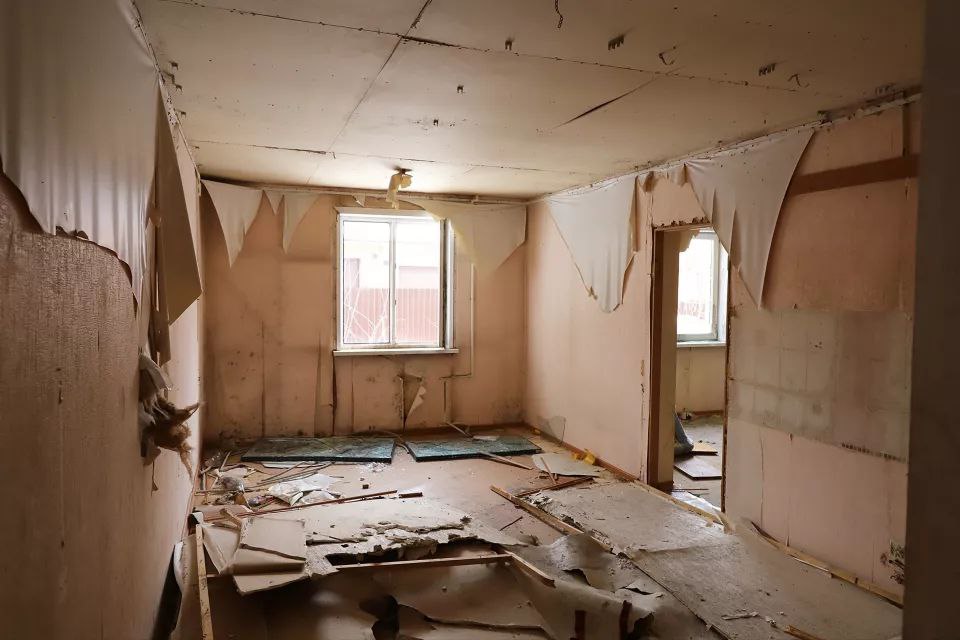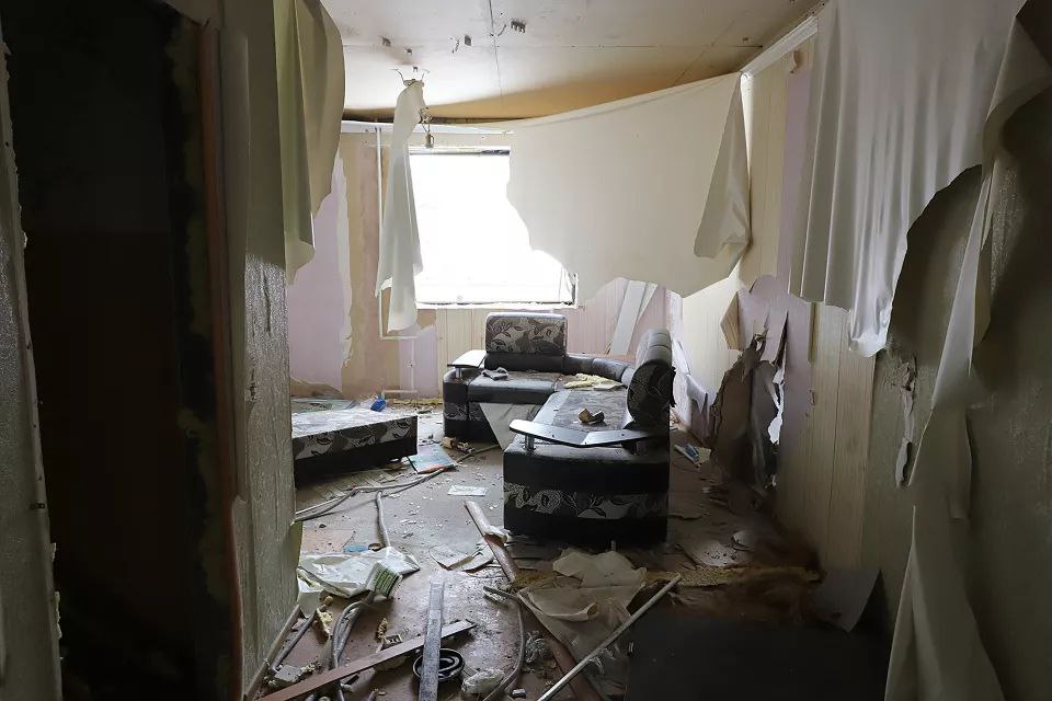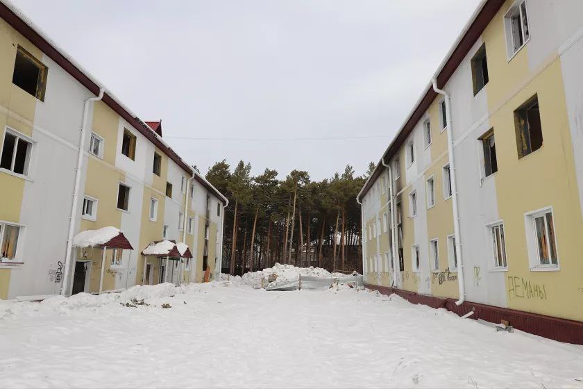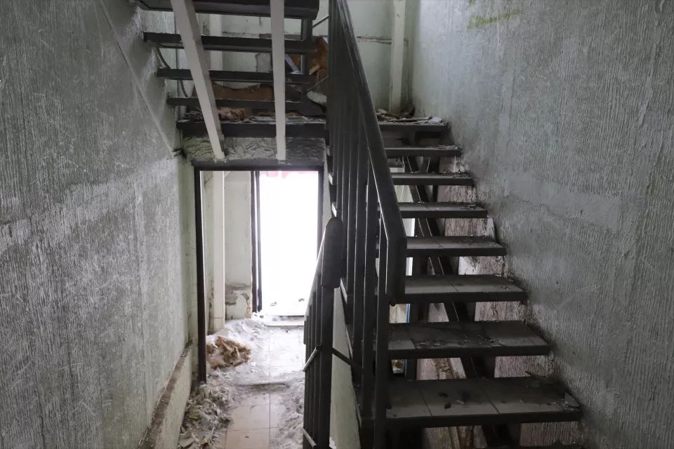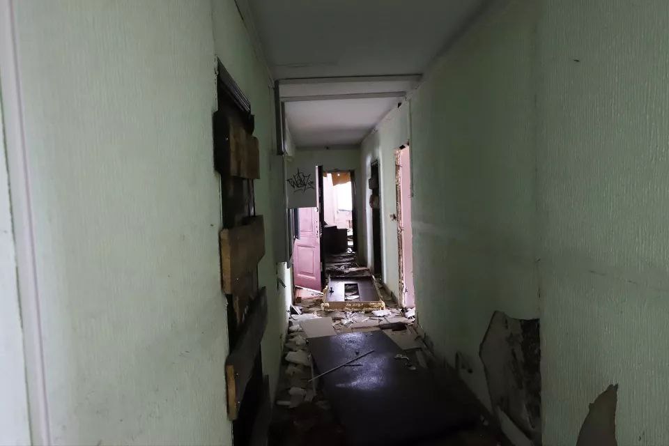 Большая часть подъездов заперта, но доступ есть в каждый - кое-где даже подставлена старая мебель, выполняющая роль лесенки. Там же, где двери подъезда нараспашку, царит хаос: в снегу, пепле от самодельных кострищ и обрывках обоев лежат брошенные жильцами вещи. Чаще всего, это старая мебель, сантехника, кухонная утварь, одежда, детские игрушки. Встречаются книги и периодика.