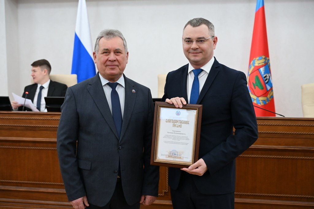 Депутат АКЗС, генеральный директор ООО «Газпром газораспределение Сибирь» Евгений Григоренко был отмечен Благодарственным письмом АКЗС.