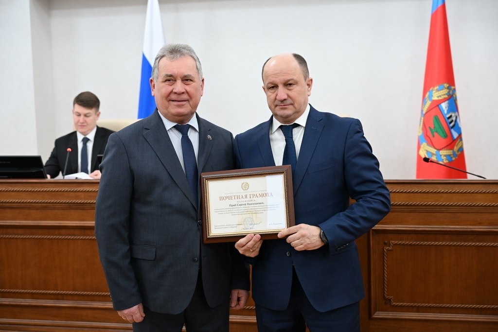 Такую же награду вручили руководителю фракции «Единая Россия» в АКЗС, генеральному директору АО «Алтайкрайэнерго» Сергею Прибу и заместителю Председателя Правительства, министру финансов Алтайского края Данилу Ситникову.