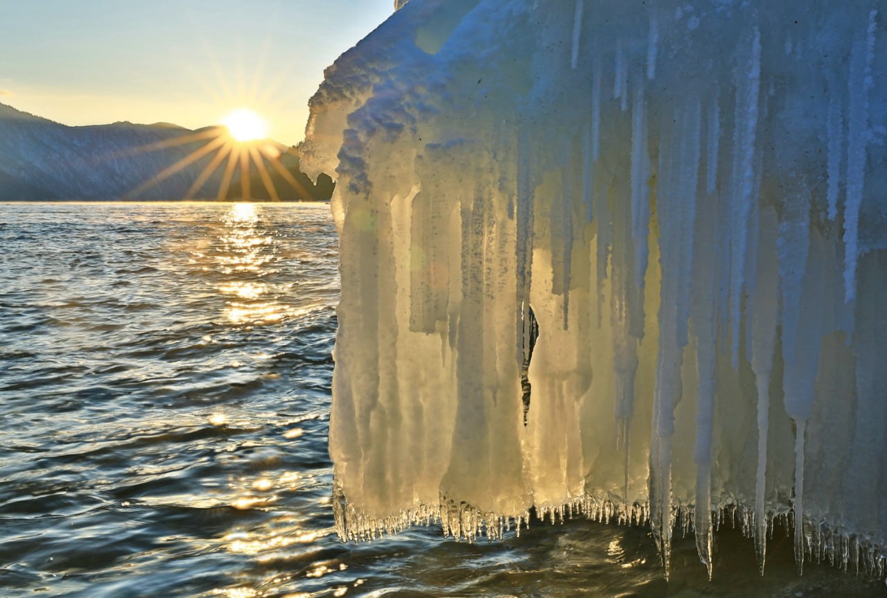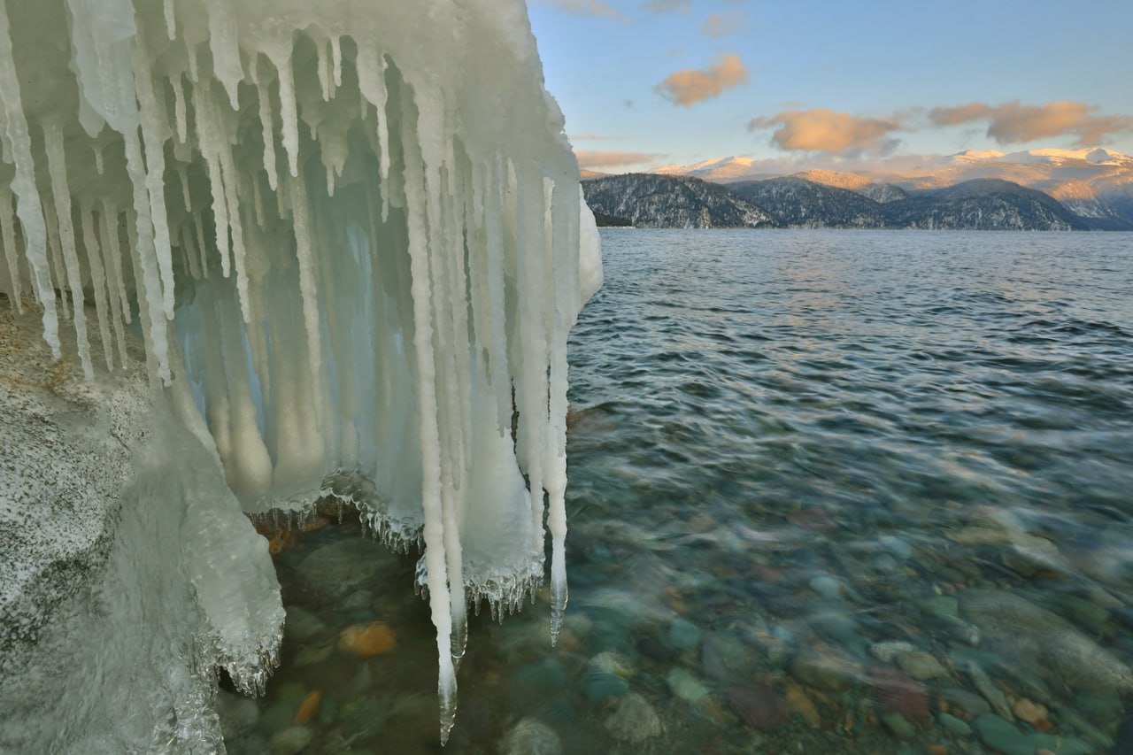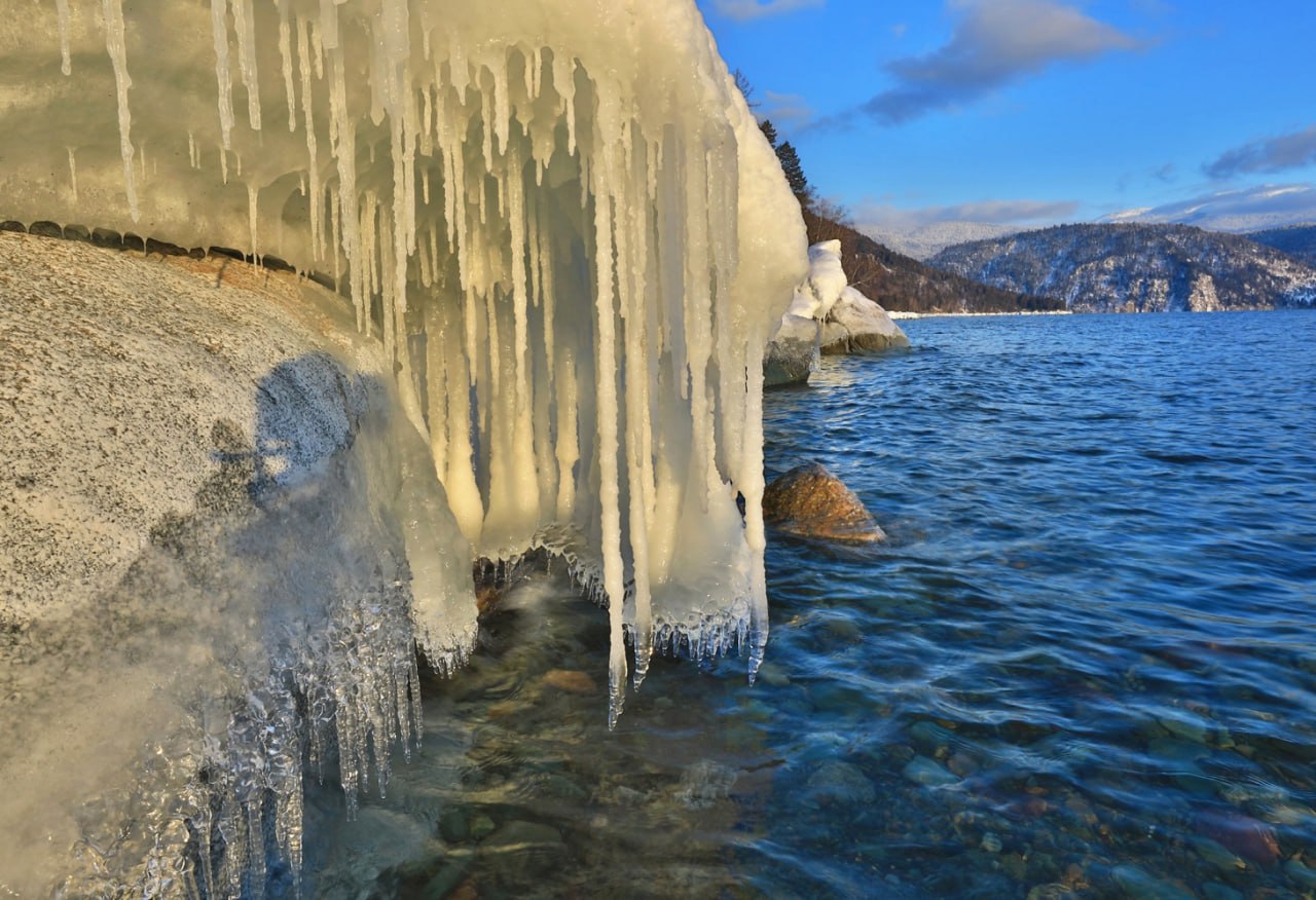 Из-за мороза прибрежные камни украсились причудливыми ледяными композициями. Снимками поделились в telegram-канале Алтайского заповедника.