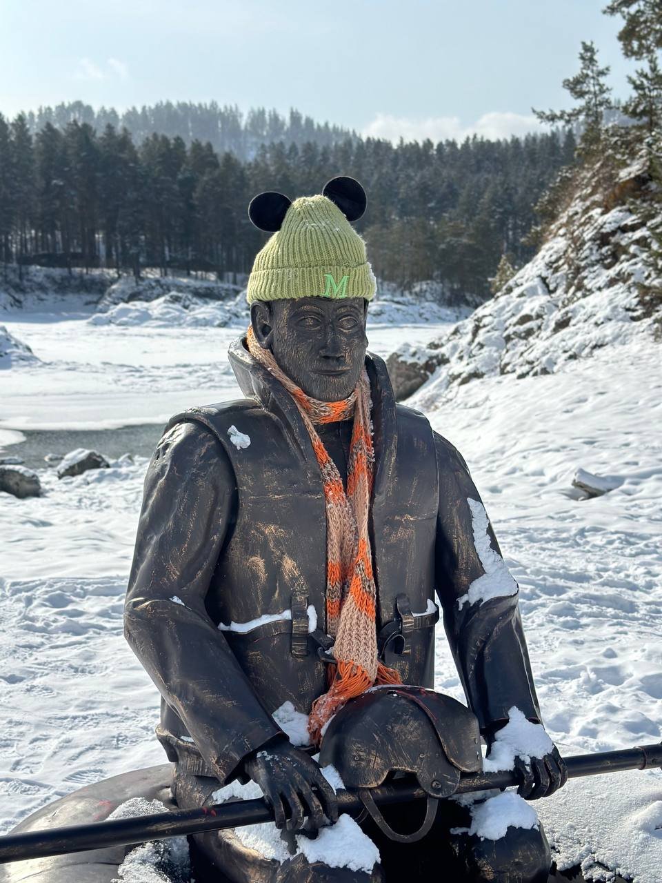 В Горном Алтае при помощи шапки и шарфа утеплили памятник рафтеру.