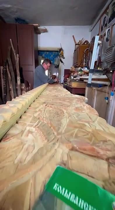 Вырезает наличник для дома с "каменными мотивами" длиной 4,5 метра.