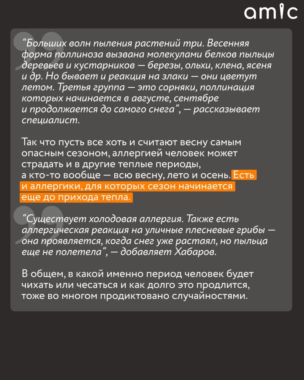 Аллергия на пыльцу (да и вообще на любое вещество) может проявиться абсолютно у любого человека, подчеркивает доктор медицинских наук, врач аллерголог-иммунолог высшей категории Алексей Хабаров. Можно спокойно жить годами, и даже подтвердить отсутствие рисков анализами, а потом внезапно зачихать из-за стечения обстоятельств.