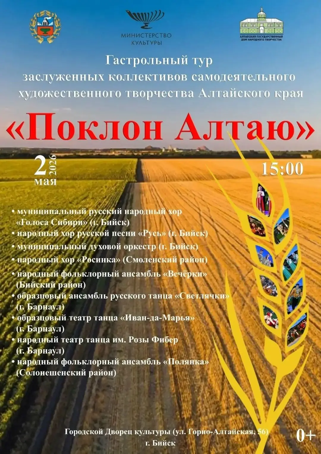 15:00 — Городской Дворец культуры. Концерт заслуженных коллективов самодеятельного художественного творчества Алтайского края «Поклон Алтаю».