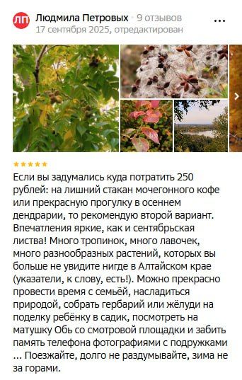 Сюда, в дендрарий, барнаульцы ходят насладиться пейзажами, сделать осенних фото и собрать листиков на детские поделки. Сообщается даже о пробках из желающих попасть в Лисавенко,Мы посмотрели в 2Гис, какие отзывы жители города оставляют об этом...