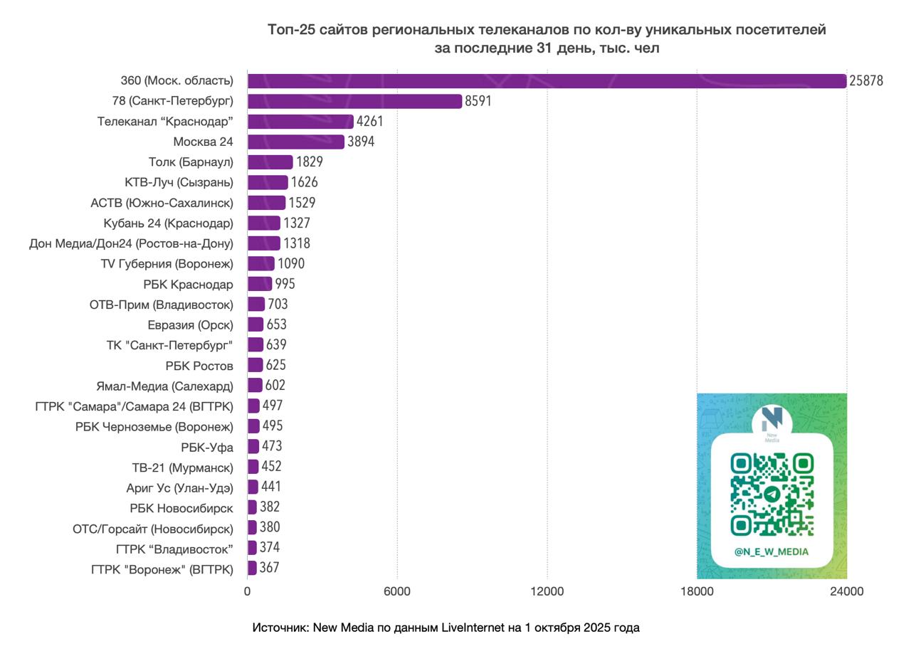 Рейтинг составил канал New Media по данным LiveInternet на 1 октября 2025 года, среди 107 телеканалов.