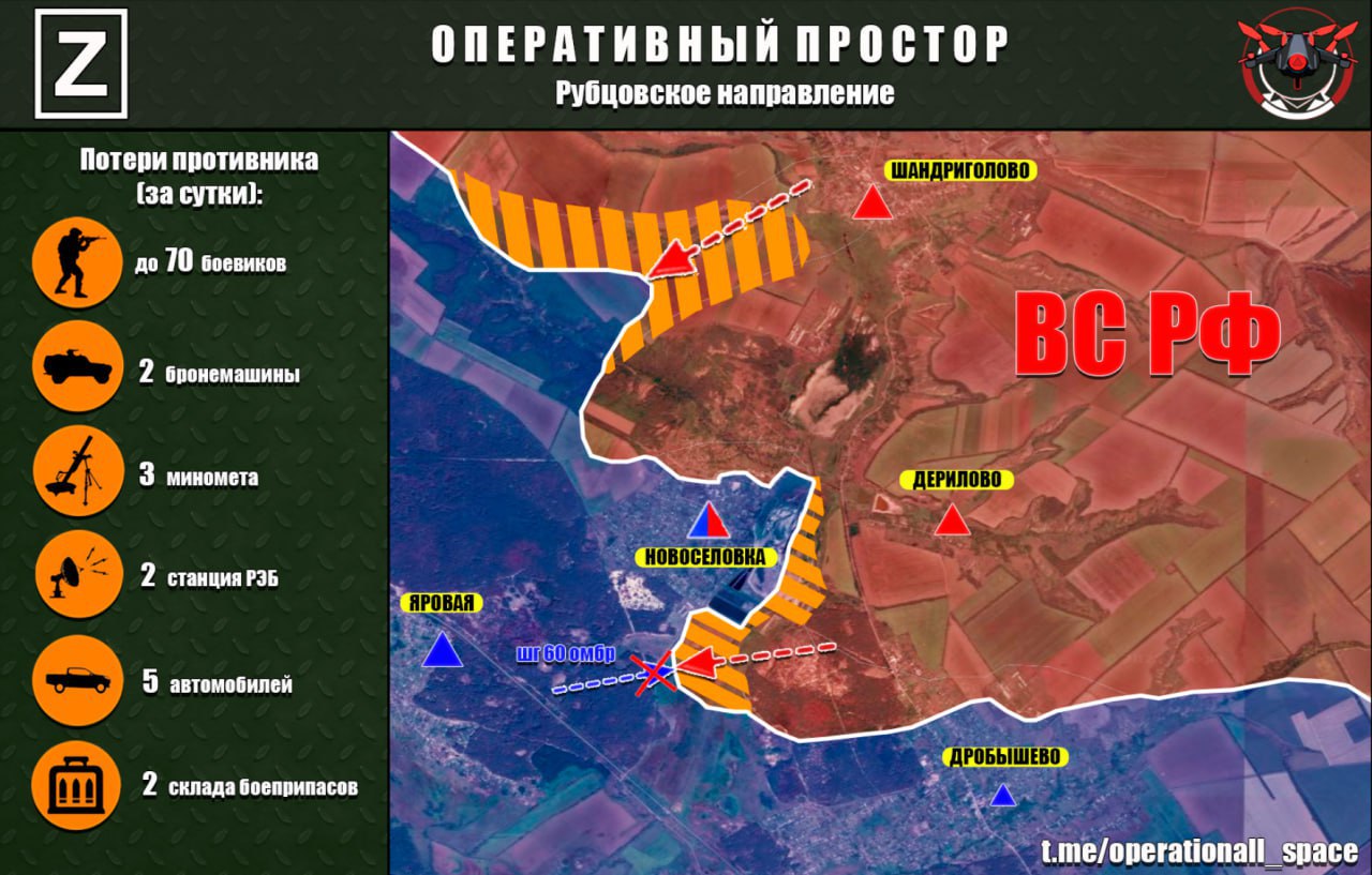 На Рубцовском (Красно-Оскольском) направлении ВС РФ сосредоточили основные усилия в направлении н.п. Яровая и на блокировании н.п. Новосёловка, сообщает "Оперативный простор":