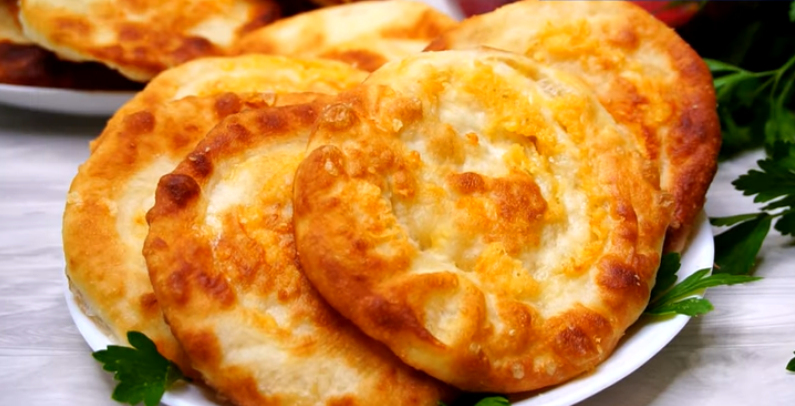 Приготовление начинается с того, что в миске требуется взбить яйцо, затем добавить кефир и растительное масло с солью. Постепенно вводится просеянная мука с разрыхлителем — получится нежное, слегка липкое тесто. Далее его раскатывают в пласт толщиной около 5 мм, распределяют по нему натертый на крупной терке сыр и формируют рулет. Рулет нарезается на шайбочки шириной 1,5-2 см, которые затем придавливаются ладонью и раскатываются в лепешки. На разогретую сковороду с растительным маслом помещаются лепешки, которые обжариваются с обеих сторон до золотистой корочки, обычно около одной минуты с каждой стороны.