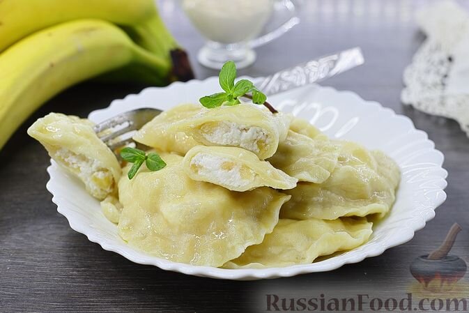 - Вареники с творогом и бананом. Эти нежные вареники готовятся на основе кефирного теста и наполнены сладкой творожно-банановой начинкой. Их рекомендуется подавать с растопленным сливочным маслом и сахаром — это просто взрыв вкуса!