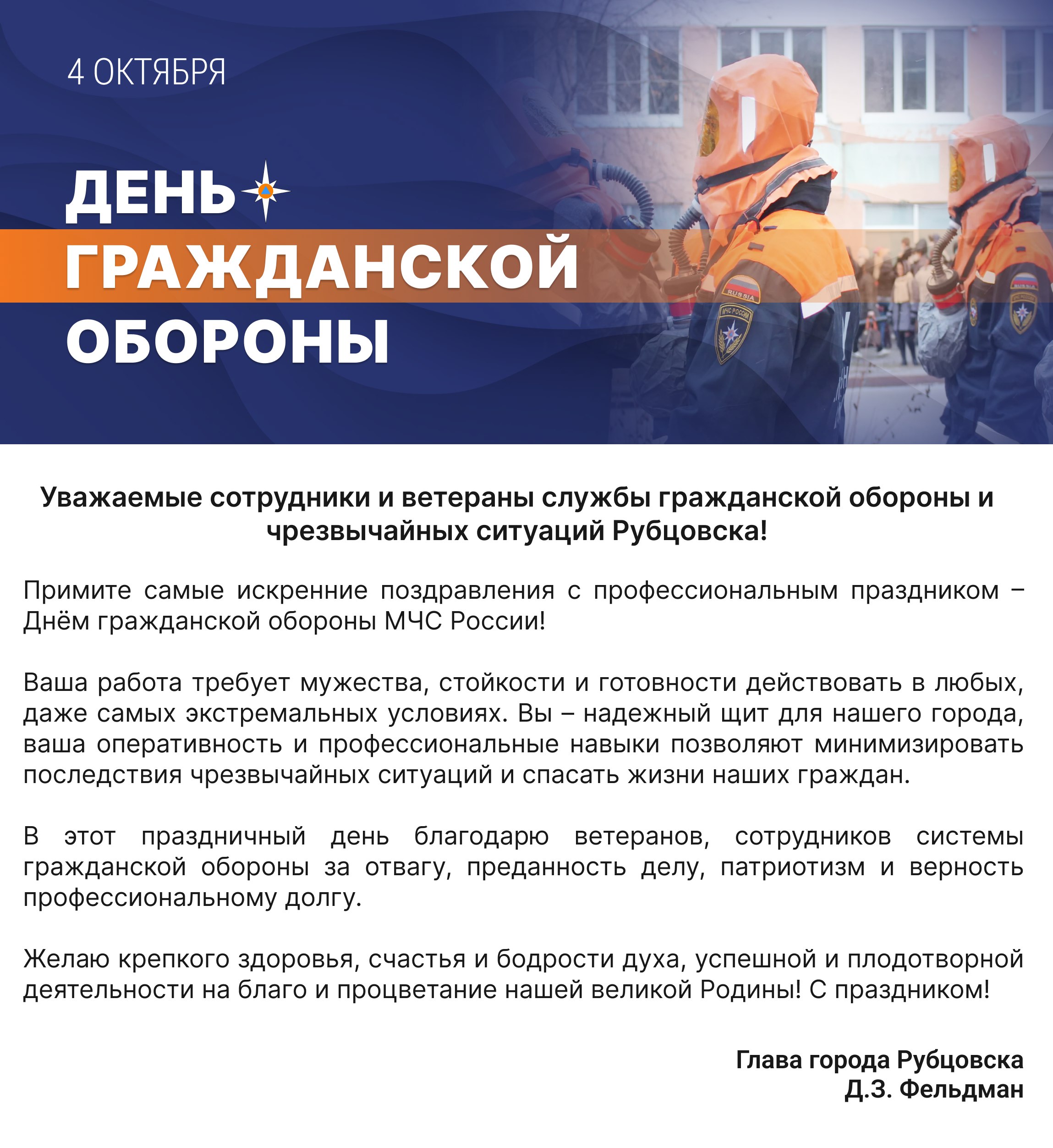 Поздравление Главы города Рубцовска Дмитрия Фельдмана с Днём гражданской обороны МЧС России