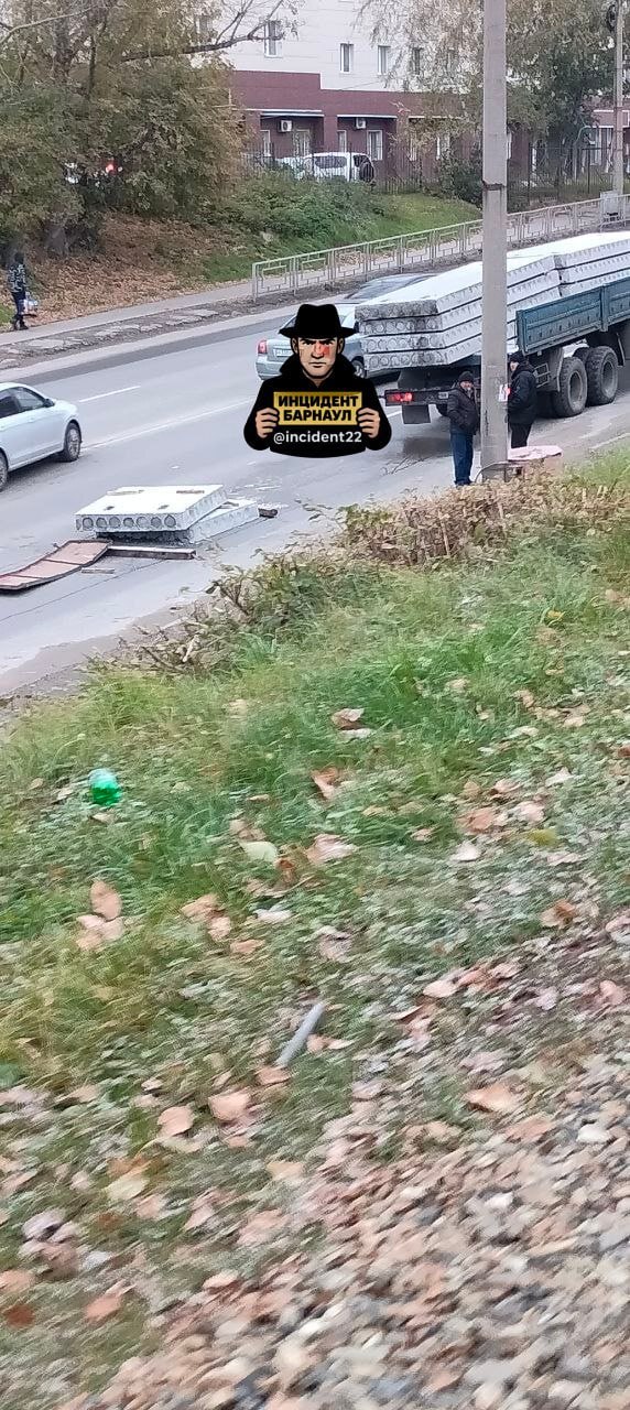В Барнауле на проспекте Калинина из прицепа грузовика выпали плиты на проезжую часть, сообщила подписчица "Инцидент Барнаул" Елена.