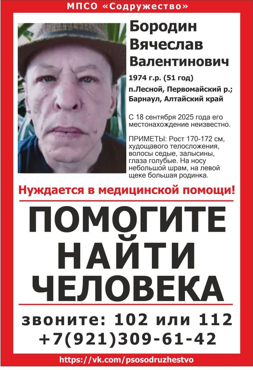 Если у вас есть информация о местонахождении пропавшего Вячеслава Валентиновича, позвоните по номеру 102 или 112.