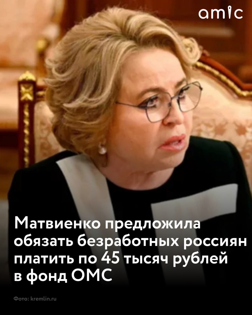 Безработные россияне должны платить 45 тысяч за медстраховку — предложение спикера Совета Федераций.