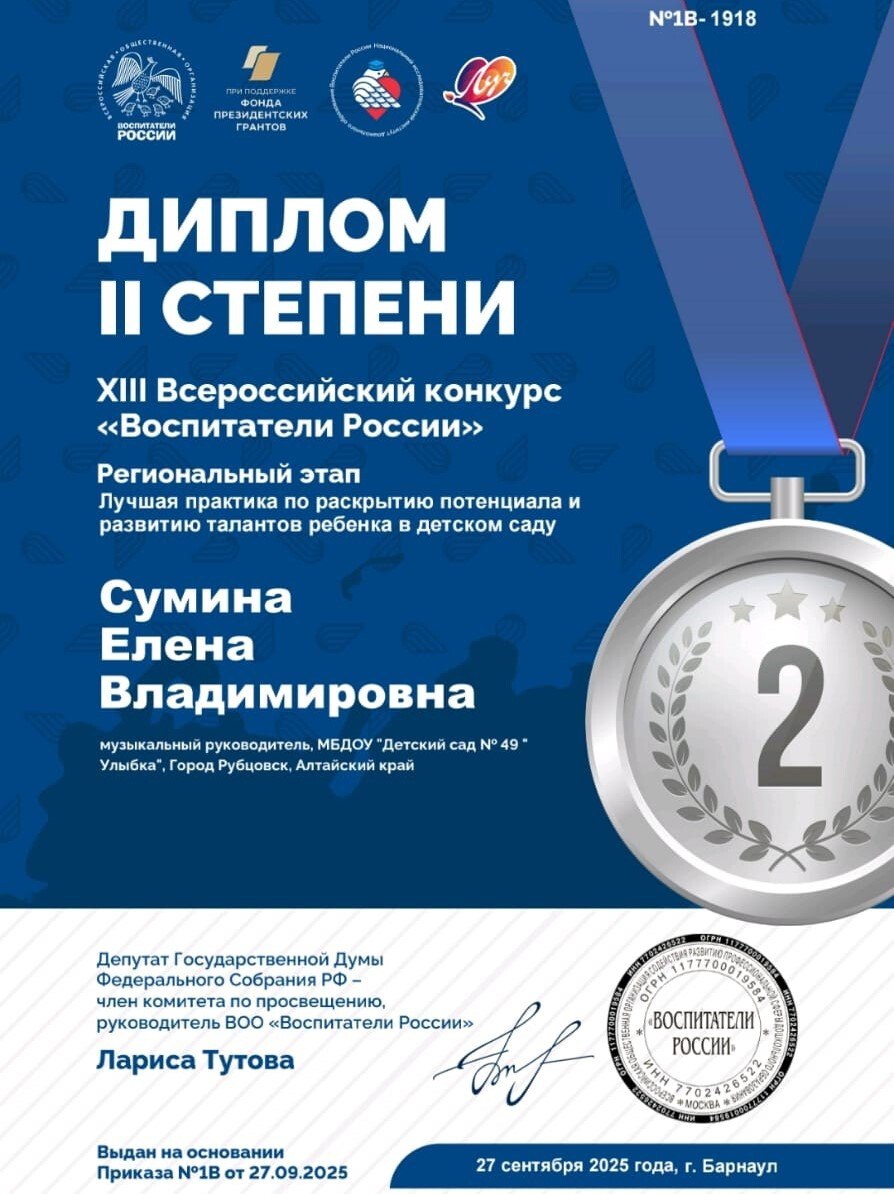Музыкальный руководитель этого же дошкольного учреждения Елена Сумина отмечена дипломом второй степени в номинации «Лучшая практика по раскрытию талантов ребенка в детском саду».