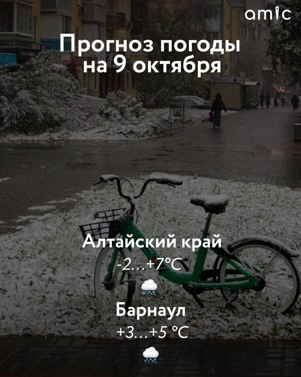 От +2 до +7 градусов ожидается в Алтайском крае. Небольшой, местами умеренный мокрый снег, местами гололедные явления. На дорогах местами гололедица. В утренние часы местами туман. Ветер юго-западный, 3–8 м/с, местами порывы до 13 м/с.
