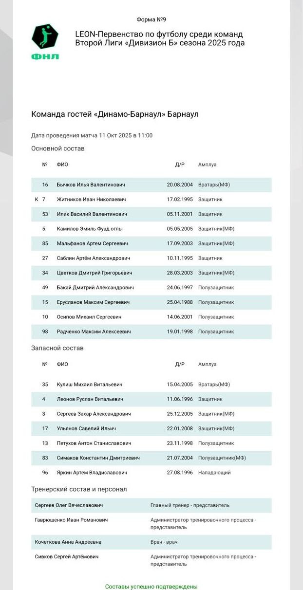Стартовый состав "Динамо-Барнаул" на матч против второго "Урала".
