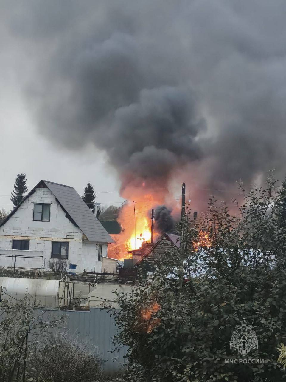 "В результате пожара поврежден двухэтажный дом, деревянная беседка, стена бани, стена гаража, а также сайдинг соседнего дома", – говорится в сообщении МЧС.