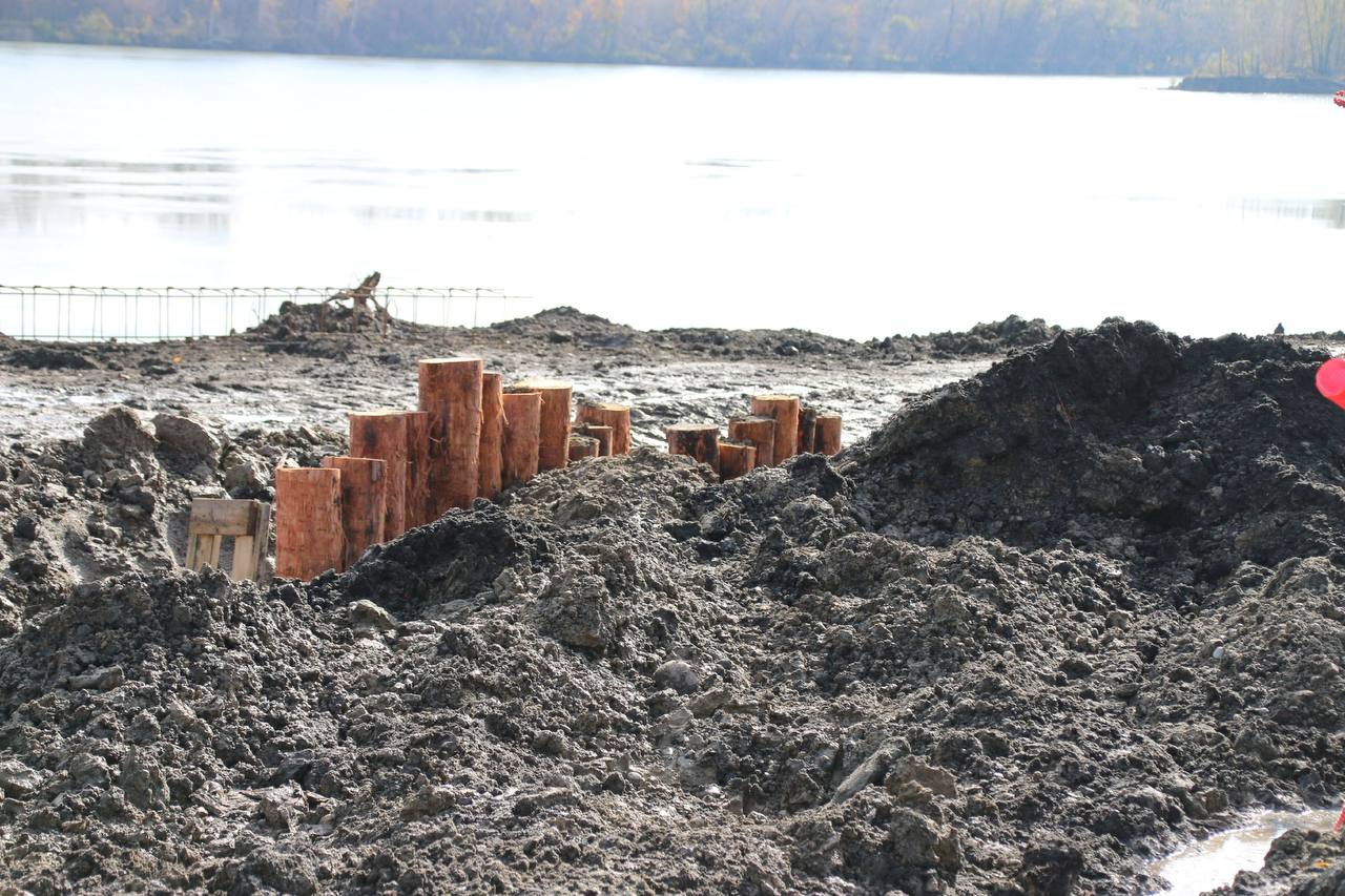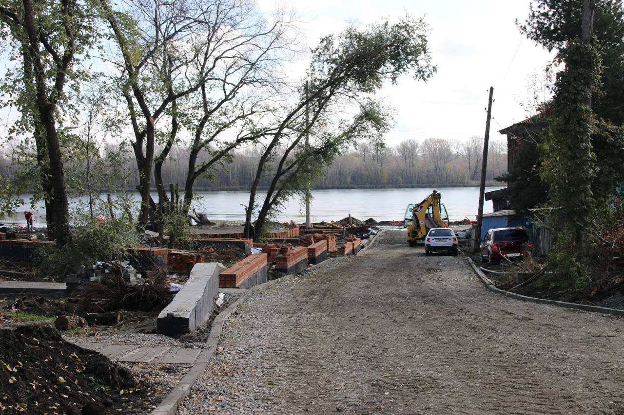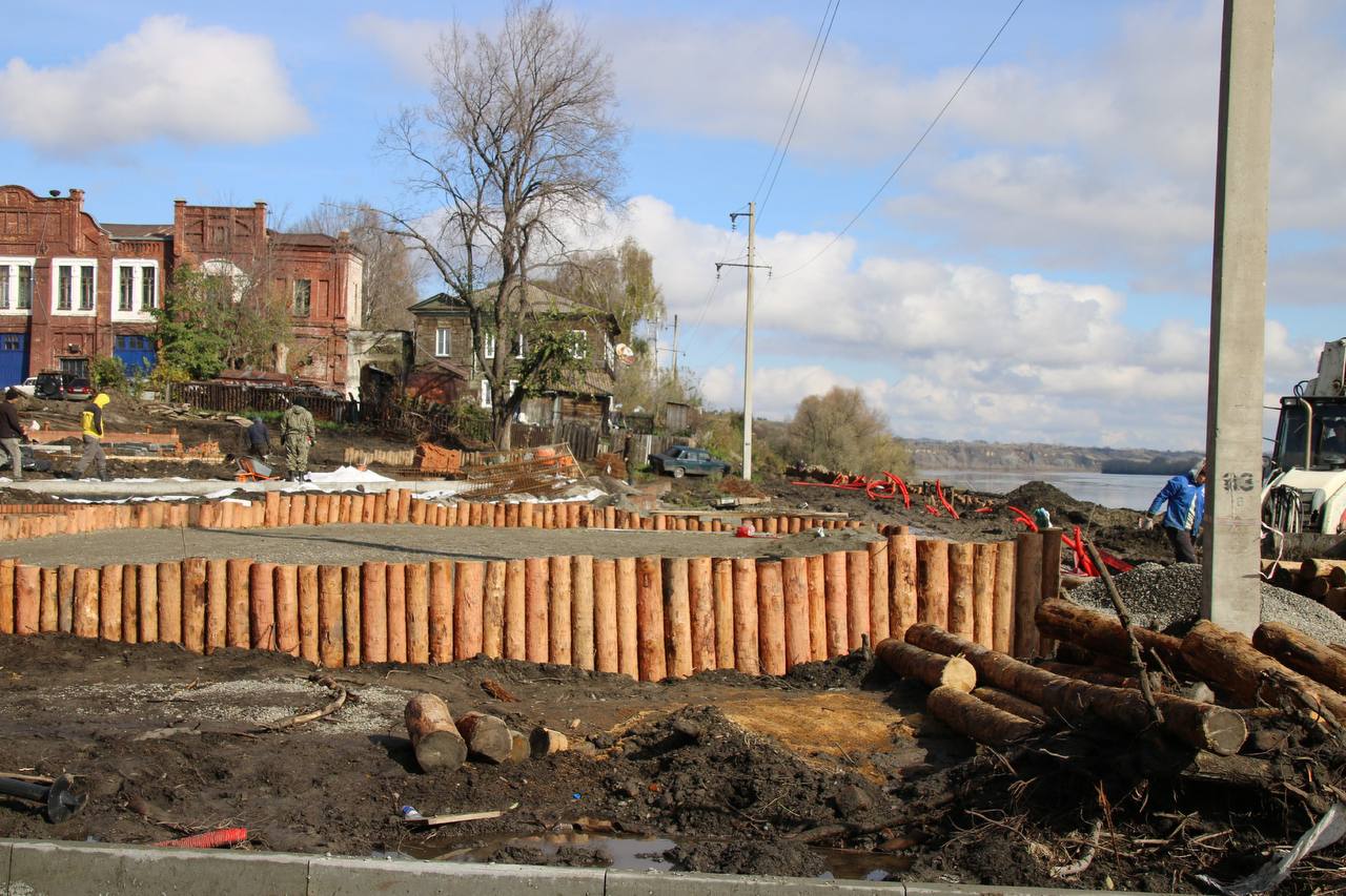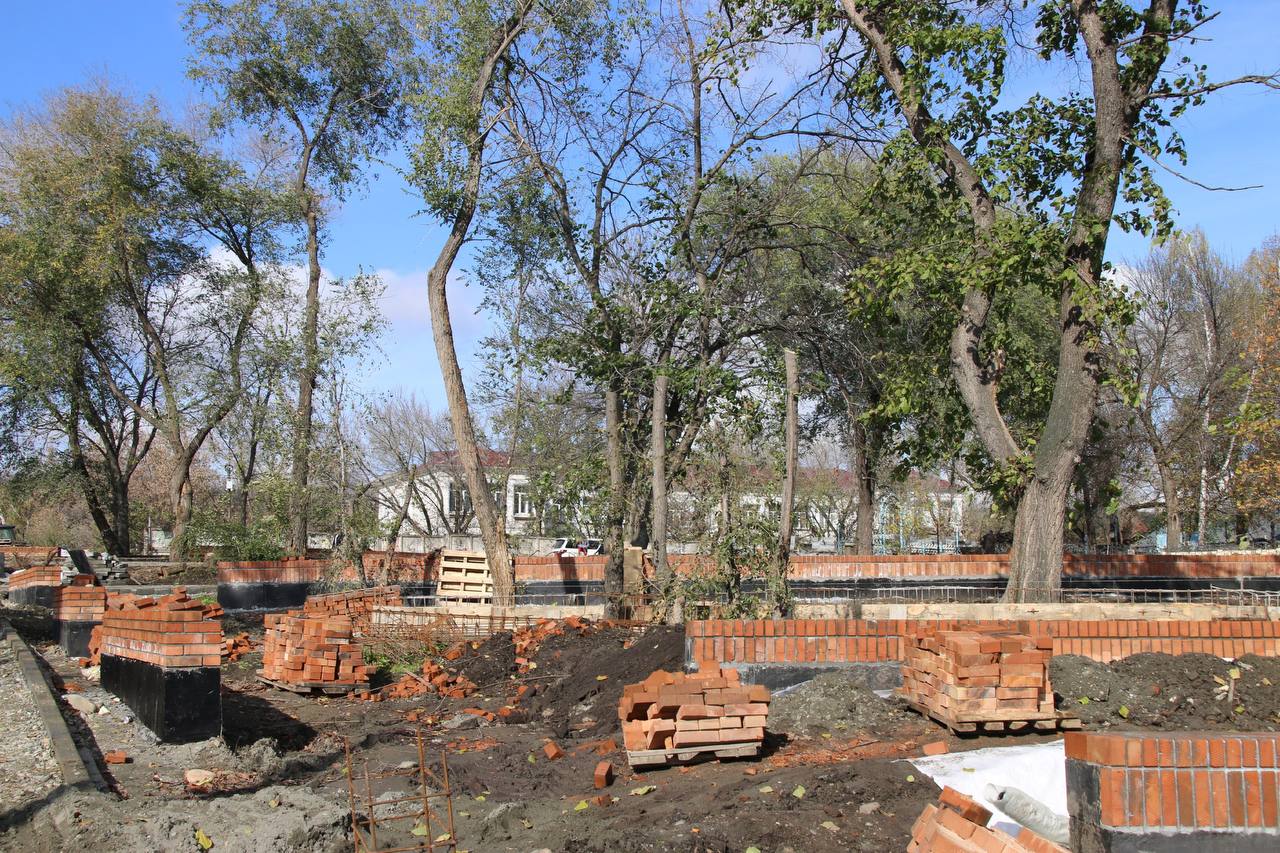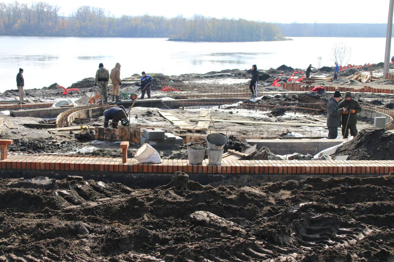 На заключительном этапе будет монтаж деревянных свай из лиственницы на террасах вдоль реки. Устройство кирпичной кладки подпорных стен уже готова на 80%.