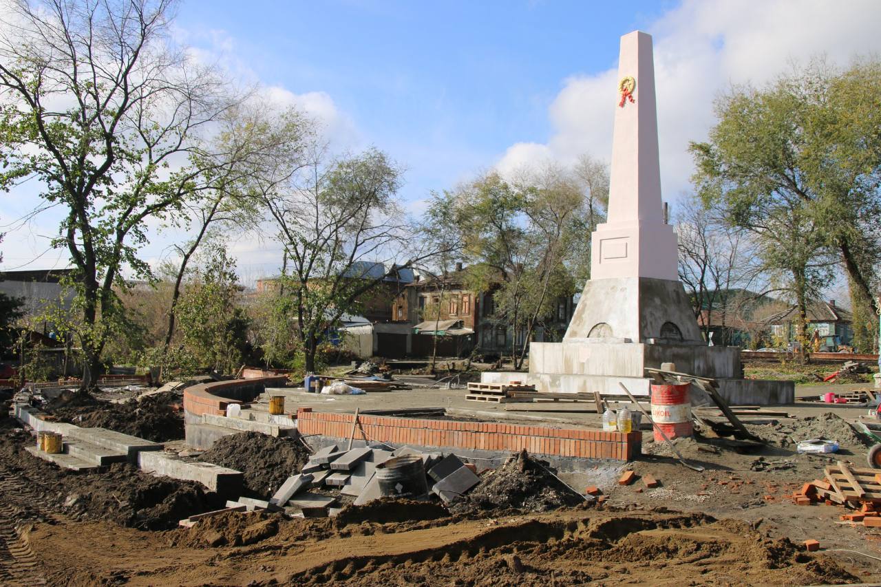 Рабочие активно возводят железобетонную лестницу, монтируют каркасные конструкции и обновляют внешний вид исторического Обелиска борцам за советскую власть.