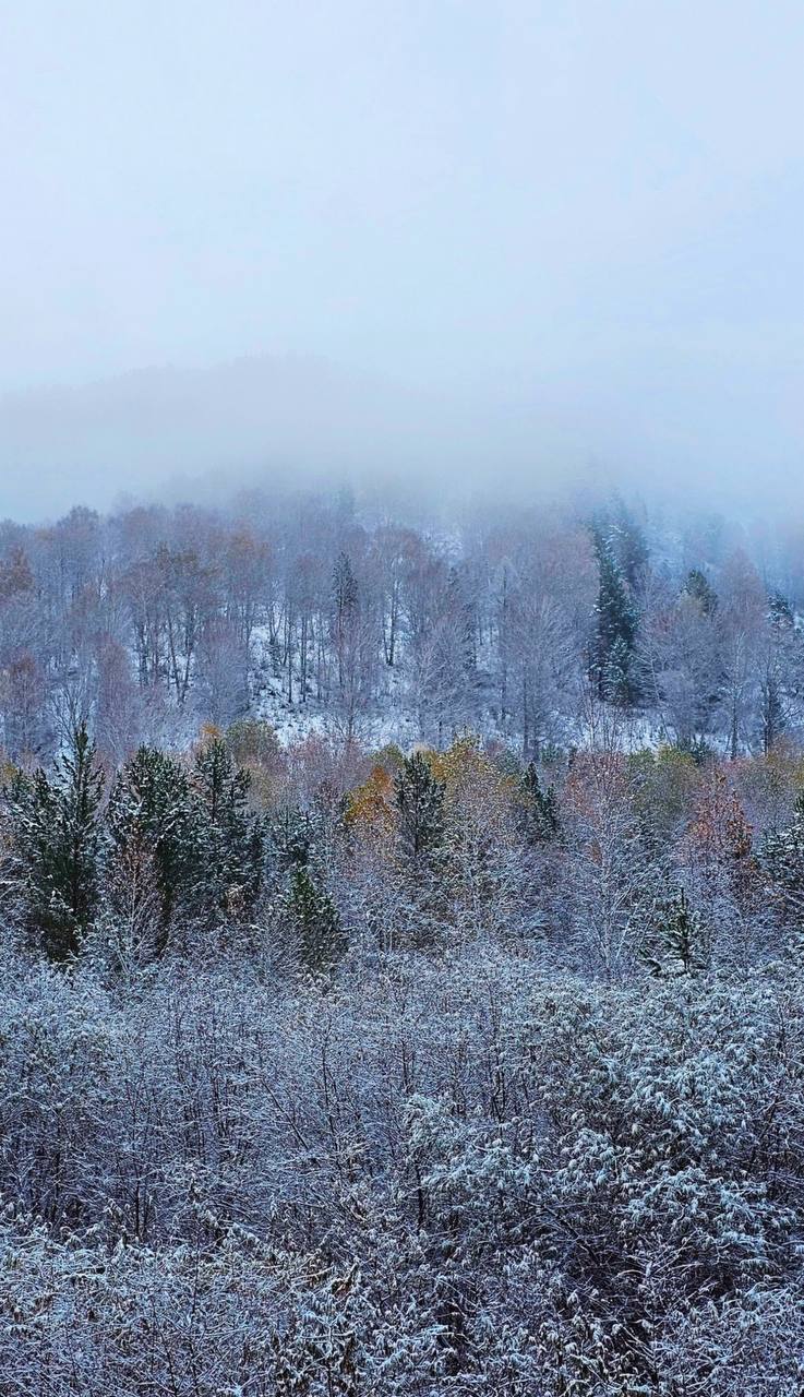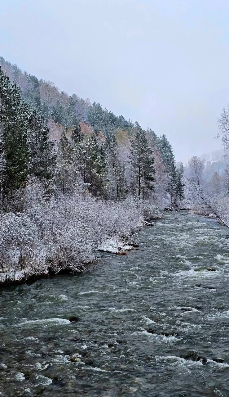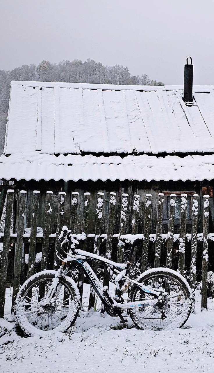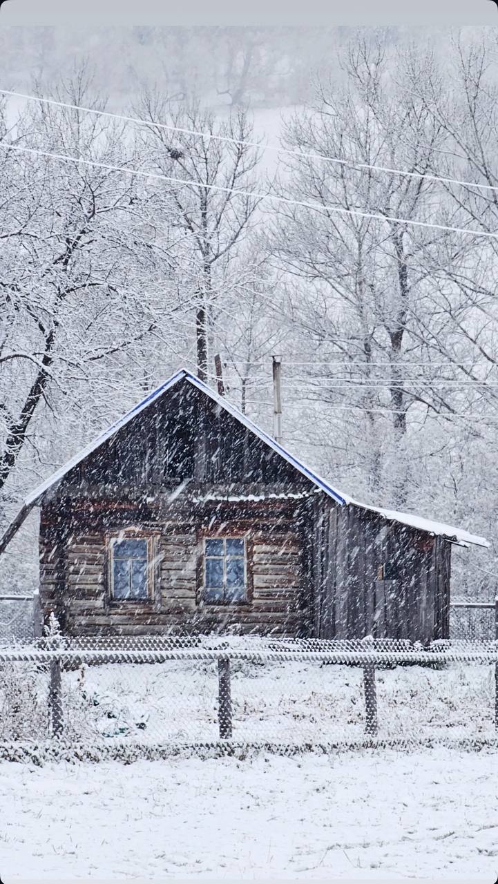 На фото — горы, реки, дома, коровы, поля и велосипед, присыпанные октябрьским снегом в Солонешенский районе.
