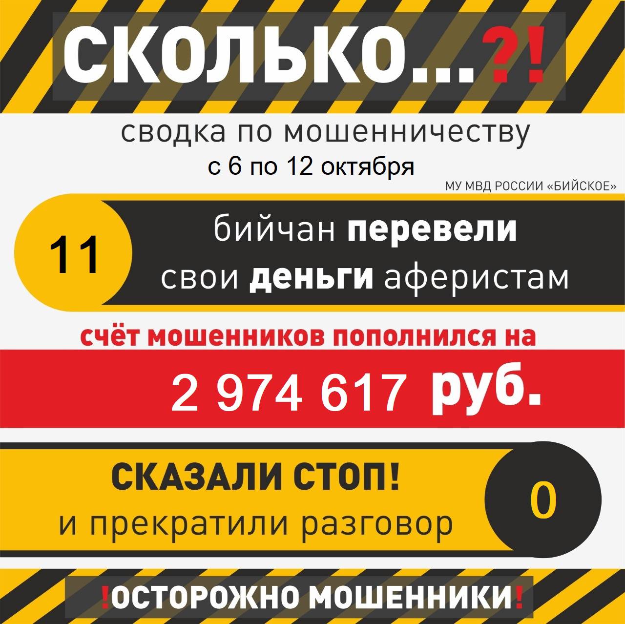 С 6 по 12 октября в полицию Бийска обратились 11 человек, пострадавших от действий мошенников. Общий ущерб составил 2 974 617 рублей.
