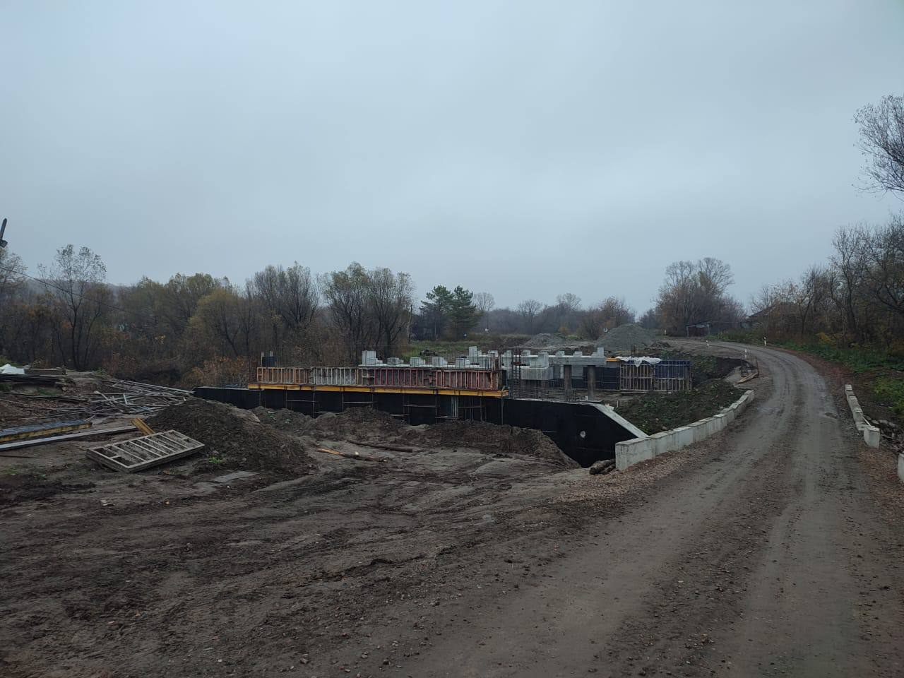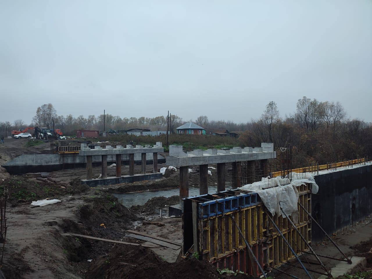 На данный момент подрядная организация уже демонтировала старые железобетонные конструкции, для обеспечения проезда построена временная объездная дорога. Также строители установили береговые и промежуточные опоры, приступают к монтажу пролетных строений.
